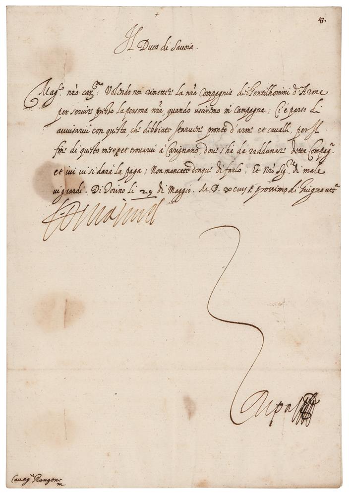 The Duke of Savoy from 1580 until his death in 1630 (born 1562) who was known as the Great and Testa d'feu (or 'Hothead'), for his rashness and military aggression; both ambitious and confident, Charles pursued a policy of expansion for his duchy, seeking to expand it into a kingdom. Untranslated manuscript DS in Italian, signed “Emmanuel,” one page, 8 x 11.5, May 29, no year. In fine condition, with some seal-related staining.