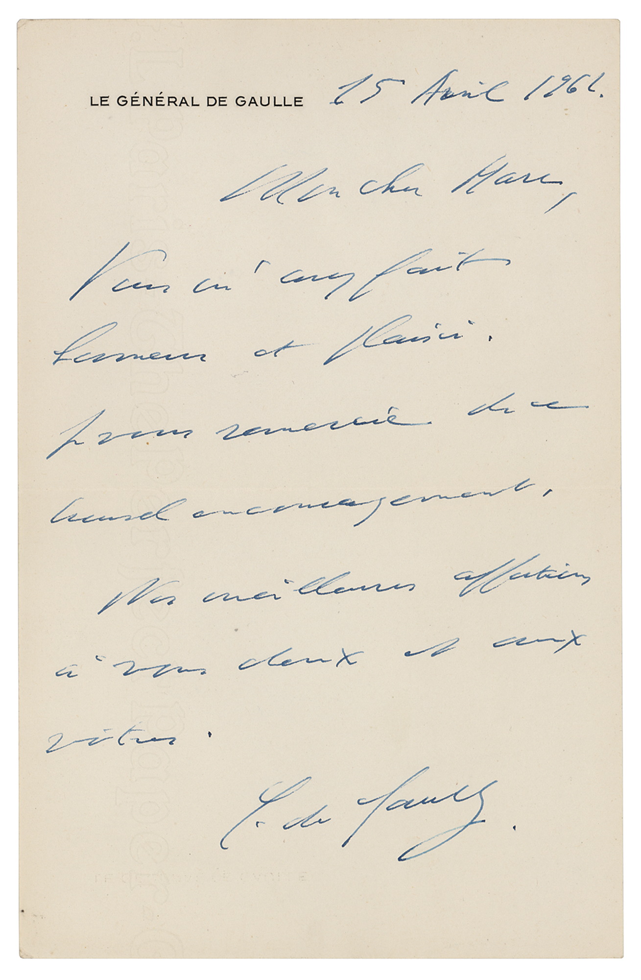 ALS in French, signed “C. de Gaulle,” one page, 5.25 x 8.25, personal letterhead, April 15, 1962. Handwritten letter to his cousin Marc Lami, in part (translated): "You have done me honour and pleasure. Thank you for this new encouragement." In fine condition. Accompanied by the original mailing envelope addressed in the hand of de Gaulle.