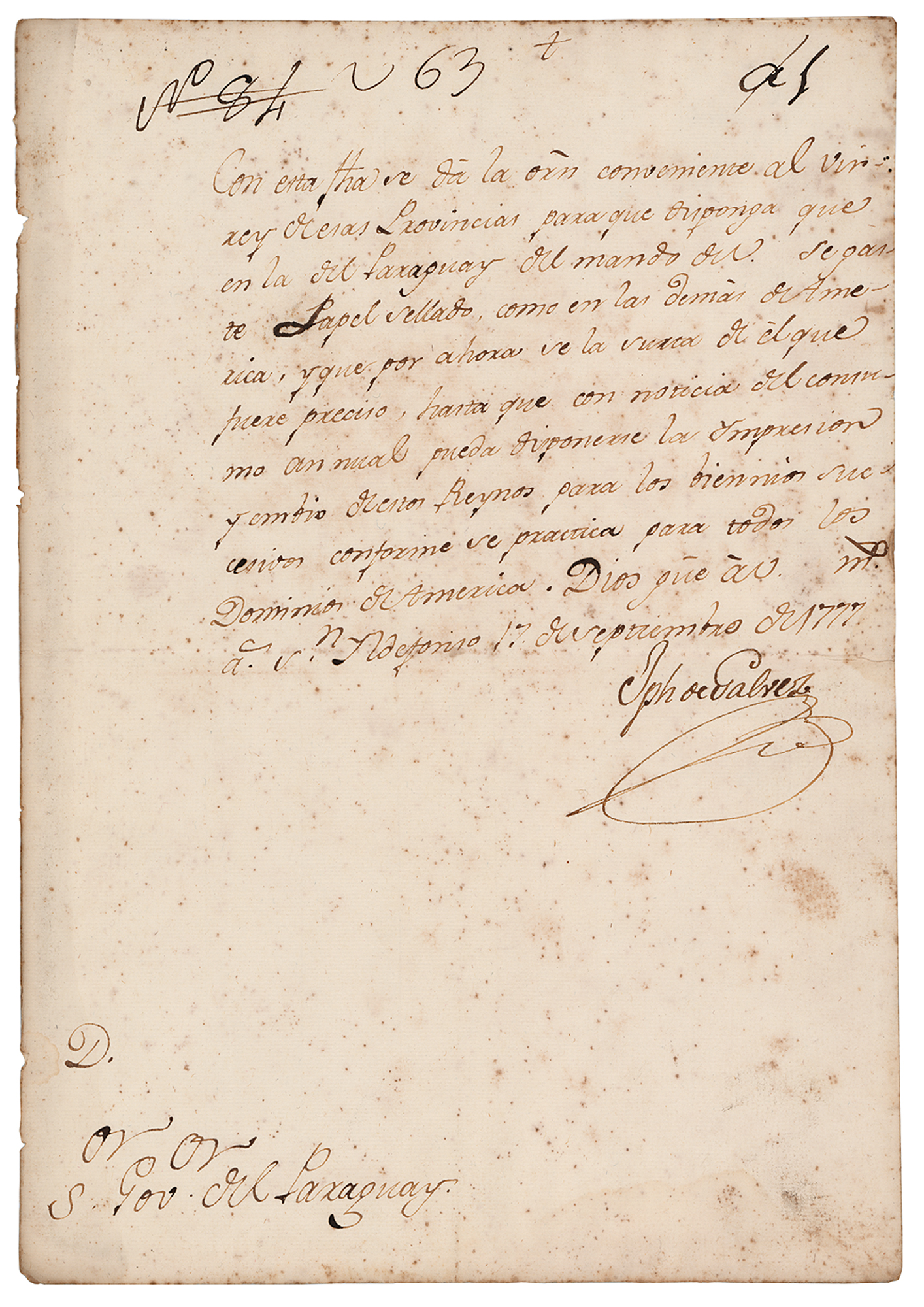 Spanish politician and lawyer (1720-1787) who served as visitor general of public finance in New Spain, governor of the Council of the Indies, and was one of the main promoters of the Bourbon reforms. In the viceroyalty of New Spain, he established a new General Command, which included the Californias, Nueva Vizcaya, New Mexico and Sonora, later adding Coahuila and Texas. Scarce manuscript DS in Spanish, signed “Jph de Galvez,” one page, 8.25 x 11.75, September 17, 1777. Addressed from San Ildefonso, an official letter issued to the Governor of Paraguay, in full (translated): "With this letter is given to the viceroy of these Provinces the convenient order to provide that in Paraguay, ruled by you, Sealed Paper should begin to be used as in the rest of the Americas and that by now you will be provided with as much paper as necessary, until the moment when the annualisation comes and the impression and change for these realms can be arranged for the next bienniums as it is practice for all the America's territories." Signed at the conclusion by Jose de Galvez y Gallardo. In fine condition, with scattered overall foxing. This document relates to the creation of the Viceroyalty of the Río de la Plata, a political-territorial entity that established the Spanish Crown in America as an integral part of the Spanish Empire. It was permanently established on October 27, 1777 , by order of the Spanish King Carlos III on a proposal from Jose de Galvez, then serving as the secretary of the Council of the Indies. A decidedly rare document signed by Galvez, whose territorial reorganization of Hispanic America did much to reshape the southwest landscape and the future of California.