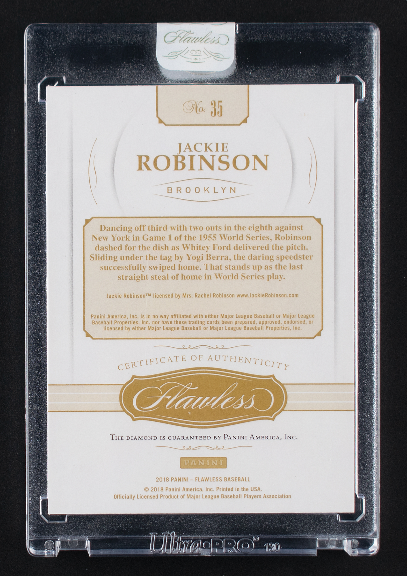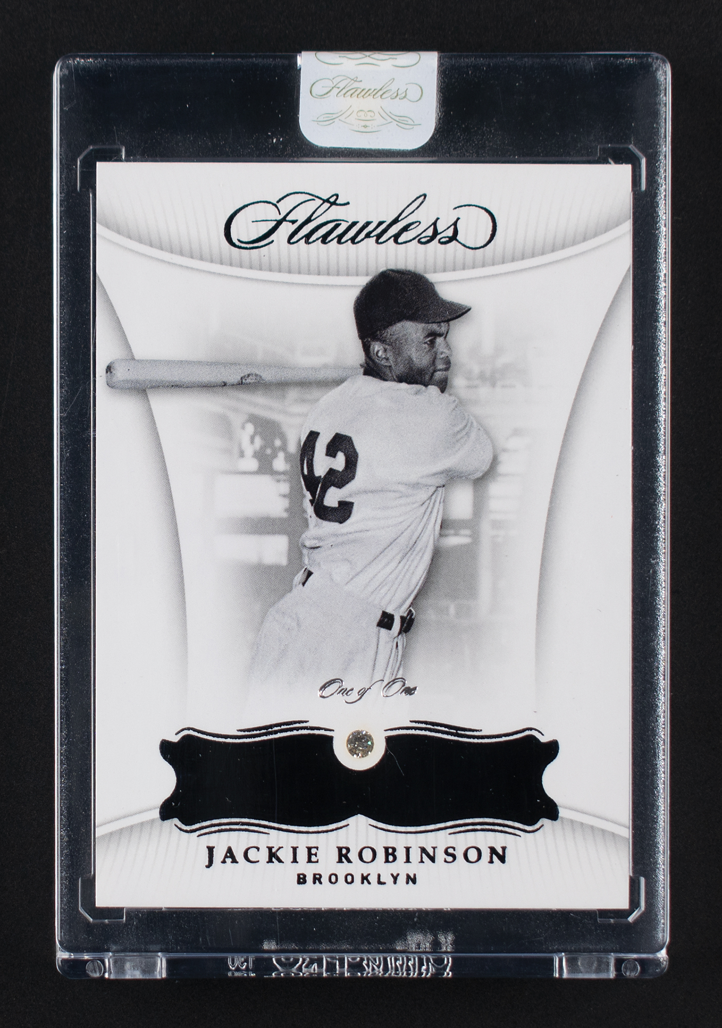 Factory sealed in its Panini Flawless holder. Rare and unique one-of-one card of barrier-breaking Brooklyn Dodgers infielder Jackie Robinson, numbered 1/1, boasting a small embedded diamond. A superior card of Robinson, whose electric play on the field—and grace amidst injustice off of it—earned him an immortal place in baseball history.