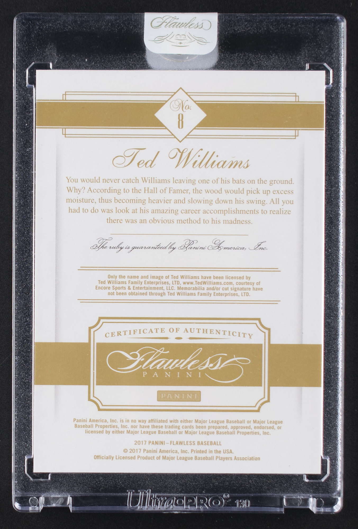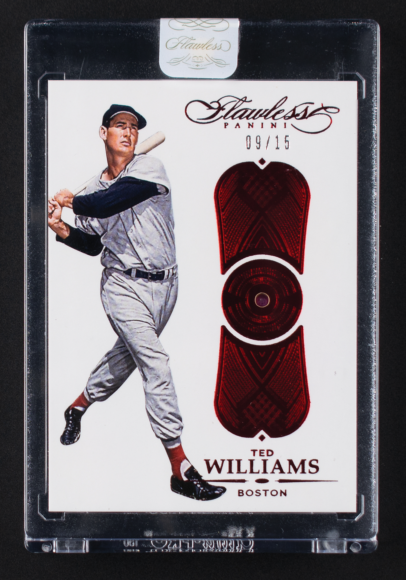 Factory sealed in its Panini Flawless holder. Spectacular card of Hall of Fame hitter Ted Williams, numbered 9/15, featuring a small embedded ruby gemstone. Highly sought-after as a jersey-number card of Boston's iconic #9.