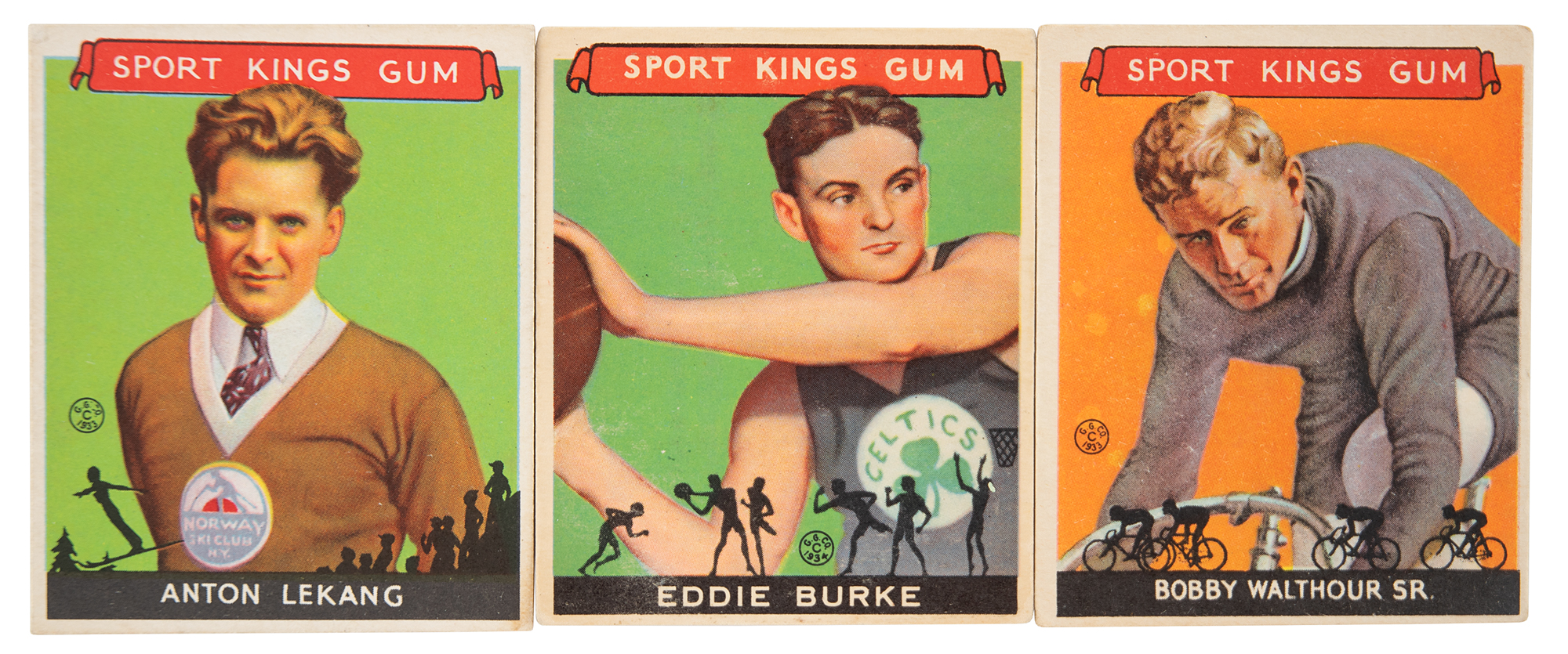 Three ungraded cards from the 1933 Goudey Sport Kings Gum set, including: #7 Bobby Walthour Sr. (VG), #10 Anton Lekang (EX), and #33 Eddie Burke (VG+). A diverse and desirable athletic trio, featuring a cyclist, ski jumper, and basketball player.