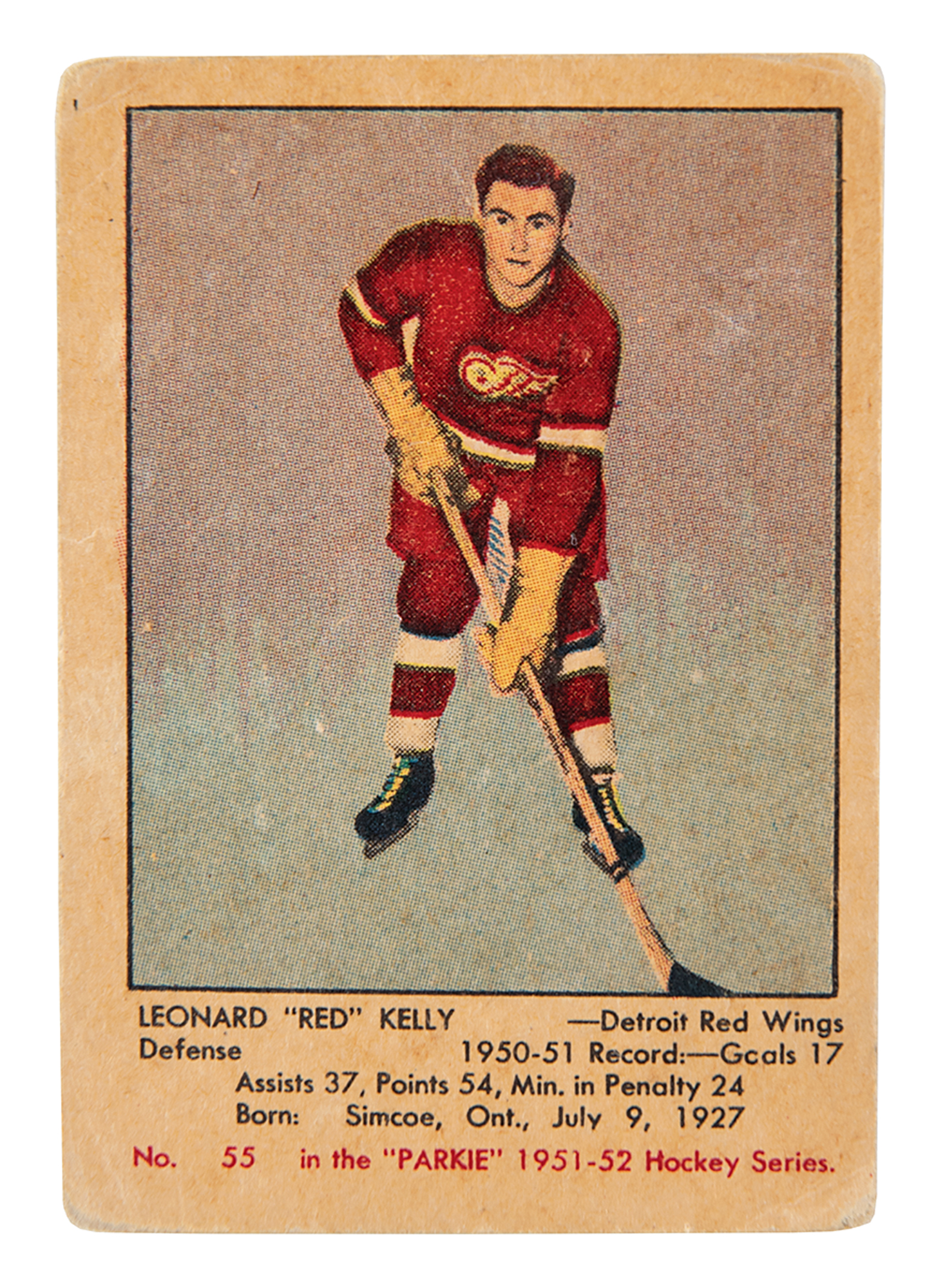 Sought-after rookie card of Detroit Red Wings Hall of Famer Leonard 'Red' Kelly, who would go on to win eight Stanley Cup championships. In good condition, with minor loss and adhesive residue to the blank reverse.