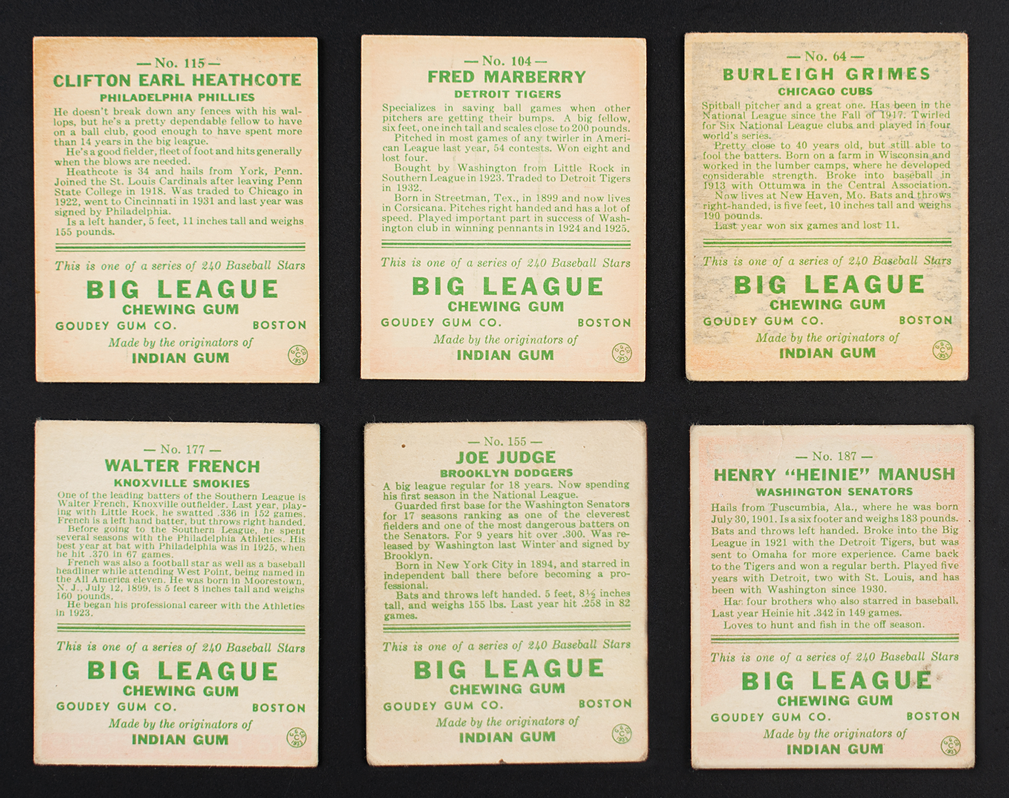 Highly appealing mid-grade lot of (33) 1934 Goudey baseball cards with a handful of semi-stars and Hall of Famers, grading overall at 10% EX, 20% VG-EX, 45% VG, and 25% G. Key cards include #64 Burleigh Grimes (VG), #104 Fred Marberry (EX), #118 Cliff Heathcote (VG-EX), #155 Joe Judge (G), #177 Walter French (VG), and #187 Heinie Manush (VG). Other cards are: #14, 18, 46, 48, 52, 65, 71, 82, 88, 91 (2), 94, 95, 101 (2), 105, 118, 126, 135, 139 (2), 152, 172, 184, 185, 214, and 215.