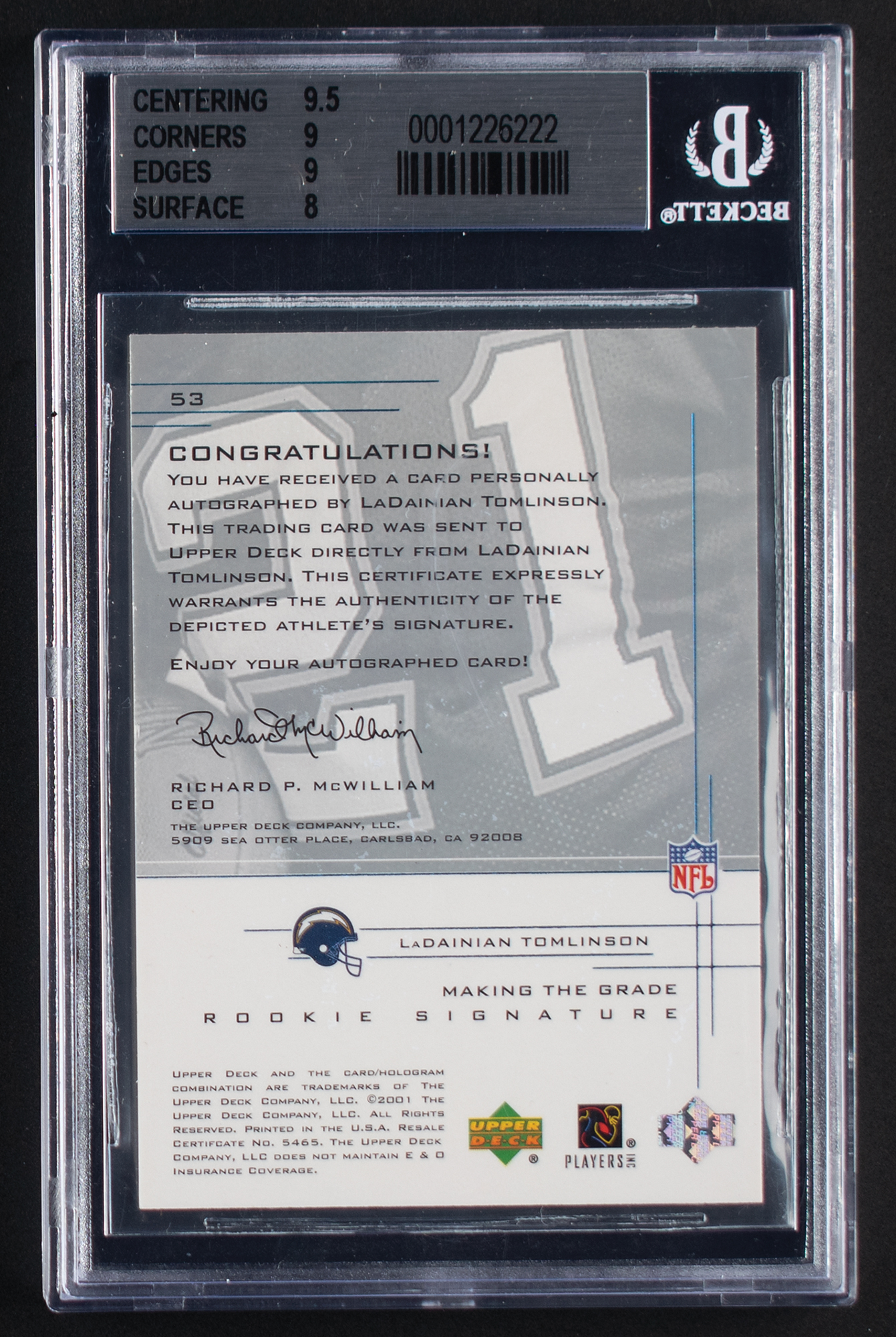 2001 UD Graded Making the Grade Rookie Signature LaDainian Tomlinson Autograph (290/500) BGS NM-MT+ 8.5