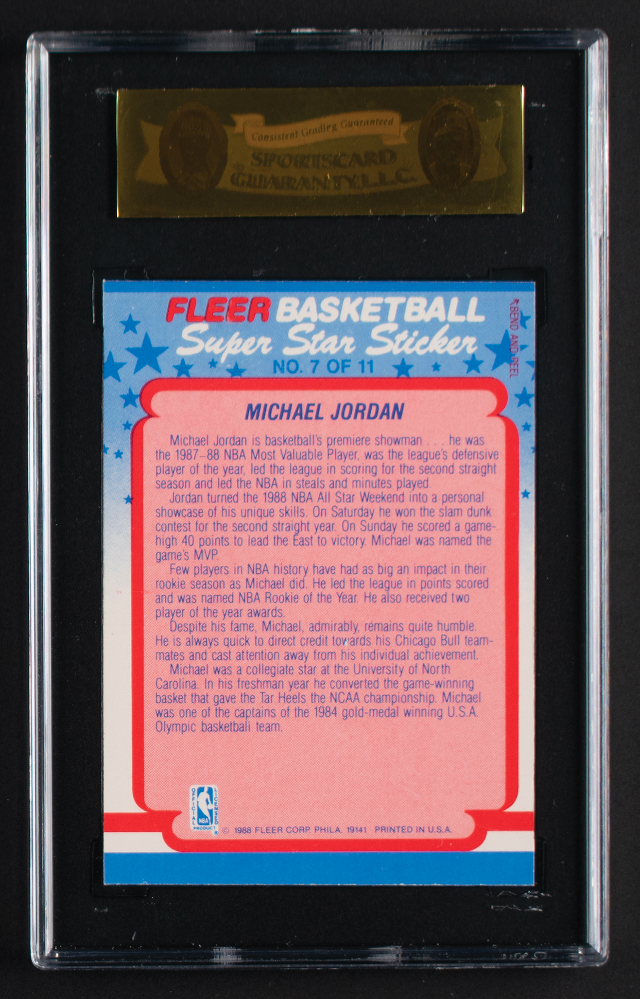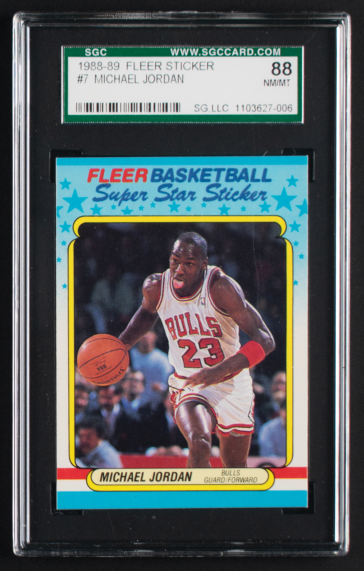 Graded by SGC NM-MT 88. Great example of this 'Super Star Sticker' showing Jordan bounding down court, tongue wagging and ball in hand, doubtlessly about to make one of his highlight-reel plays. Well-centered left-to-right with sharp corners and bright coloration.
