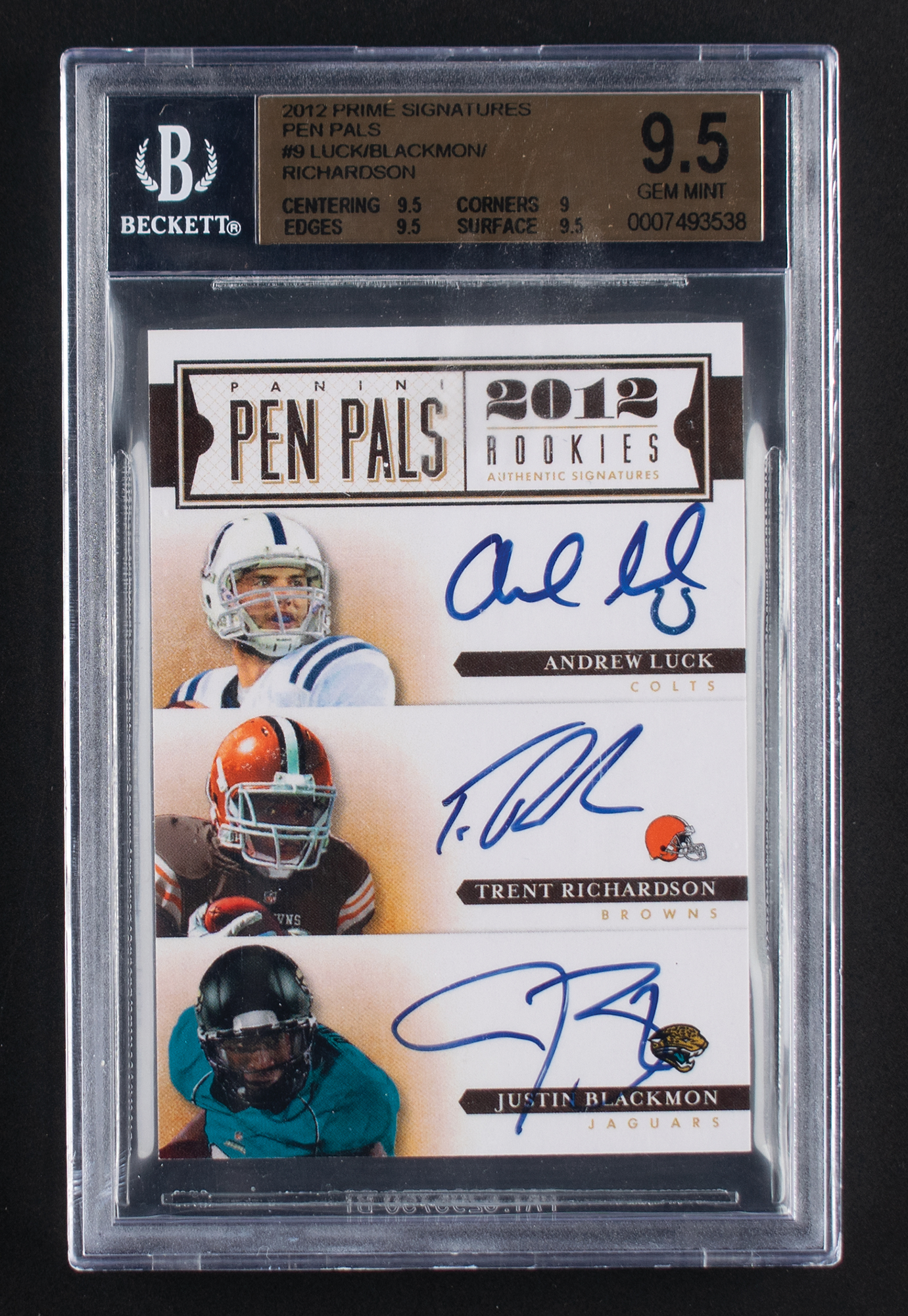 Graded by BGS GEM MINT 9.5, with an autograph grade of 10. Sensational triple autograph card of top rookies Andrew Luck, Trent Richardson, and Justin Blackmon, boasting perfect blue felt tip signatures of all three. A stunning card featuring three of the top five picks of the 2012 NFL Draft, and one that begs the question: 'what could have been?'