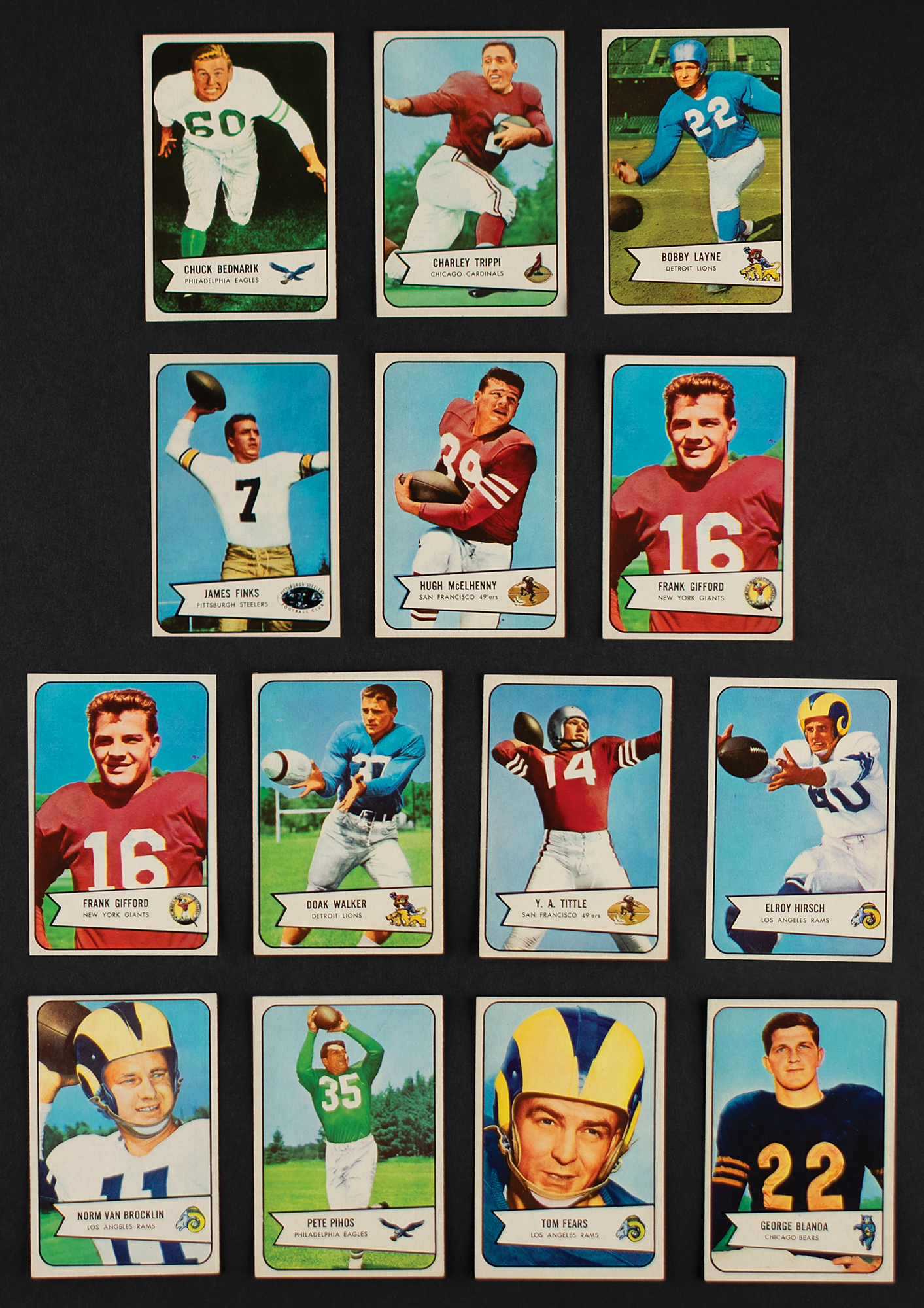 Superb lot of (65) 1954 Bowman football cards, grading EX to NM overall. Key cards include: #8 Norm Van Brocklin (EX), #9 Pete Pihos (EX), #20 Tom Fears (EX), #23 George Blanda (EX-MT), #32 Elroy Hirsch (EX-MT), #41 Doak Walker (VG-EX), #42 Y. A. Tittle (EX), #52 Lou Groza (EX-MT), #53 Bobby Layne (EX), #54 Hugh McElhenny (NM), #55 Frank Gifford (EX-MT), #57 Chuck Bednarik (EX-MT), #60 Charley Trippi (EX), and #61 James Finks (EX). Other cards are: #7, 10, 11, 13, 14, 15, 16, 17, 18, 19, 21, 22, 24, 25, 26, 27, 28, 29, 30, 31, 36, 37, 38, 39, 43, 44, 47, 48, 49, 50, 51, 56, 58, 59, 62, 63, 64, 65, 66, 67, 68, 69, 70, 71, 72, 73, 74, 97, 98, 99, and 113. An appealing, star-studded grouping of mid-to-high grade vintage football cards.
