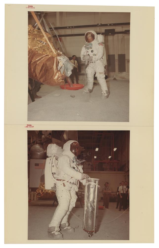 Two original vintage color glossy 10 x 8 red-numbered NASA photos (S-69-31051 and S-69-31057) of Commander Neil Armstrong during Apollo 11 training exercises: one shows Armstrong, his face visible through his helmet, looking skyward and balancing a large sample container, and the other depicts Armstrong picking up a rock near the leg of the lunar module. Reverse of both photos bear "A Kodak Paper" watermarks. In overall very fine condition.