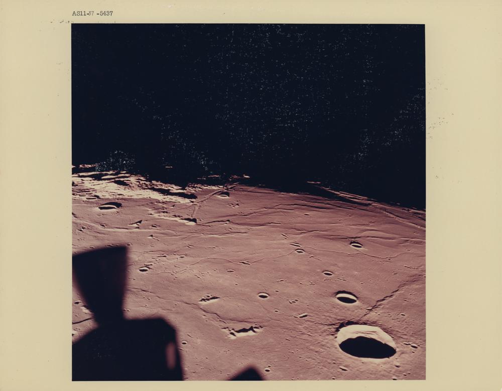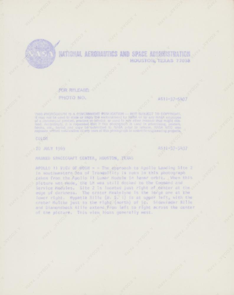 Official color glossy 10 x 8 numbered NASA photo (AS11-37-5437) of the Sea of Tranquility landing site for the Apollo 11 Lunar Module Eagle. Reverse bears "A Kodak Paper" watermarks and purple NASA caption text. In fine condition, with light surface scuffing.
