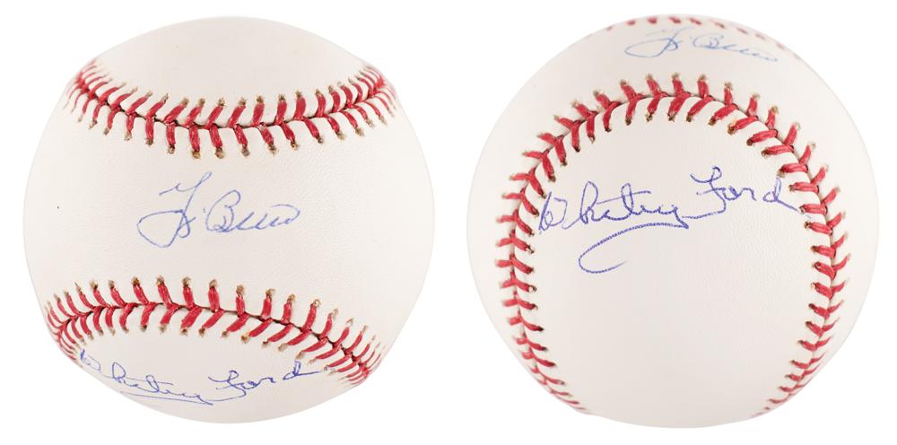 Official Rawlings Major League (Selig) baseball signed in blue ballpoint on the sweet spot by Yogi Berra, and on the lower panel by Whitey Ford. In very fine condition, with MLB and Fanatics holograms affixed to the rear.