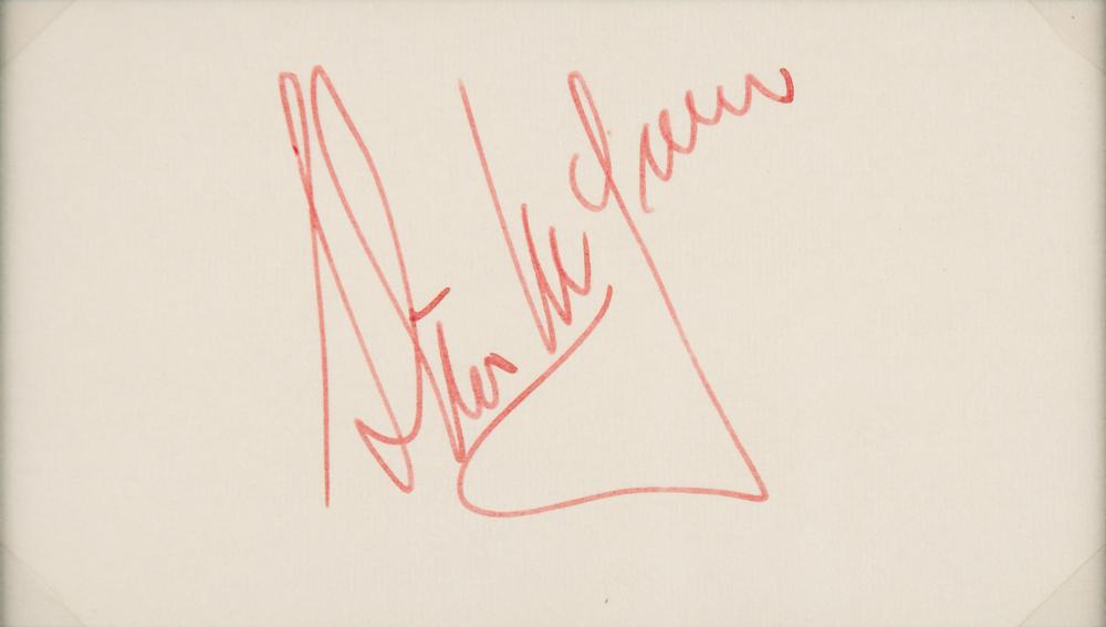Fantastic red felt tip signature, "Steve McQueen," on an off-white 4.75 x 2.75 card. Handsomely double-matted with a portrait of the actor to an overall size of 16.25 x 22. In fine condition.
