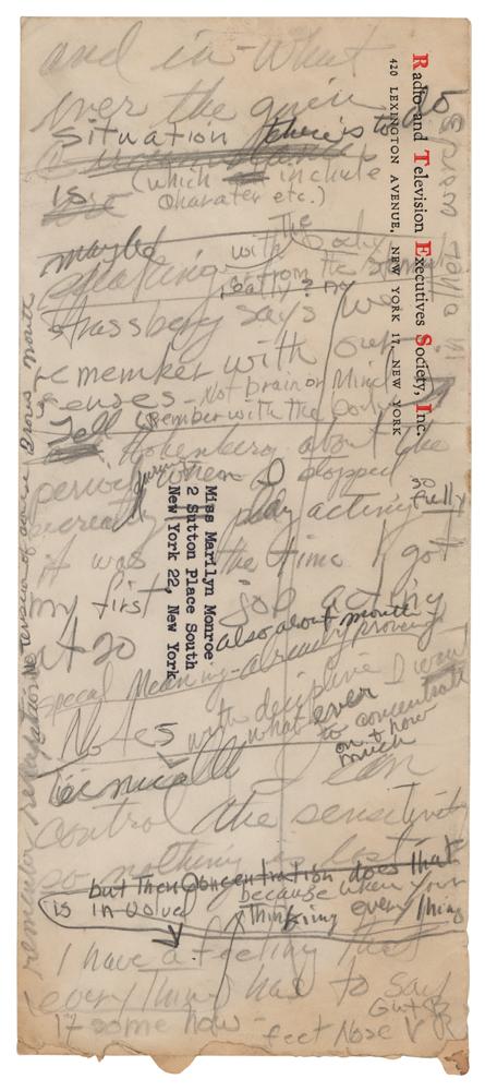 Radio and Television Executives Society, Inc. mailing envelope addressed to "Miss Marilyn Monroe" at 2 Sutton Place South in New York City, 9.5 x 4, which contains an array of handwritten pencil notations by Monroe that start on the reverse and continue on the front. The notes cover the envelope, overlapping and intertwining, and were likely taken during an acting class with Lee Strasberg at the Actors Studio in New York City. In part: "I somehow am seeing with my body also and when I am truly listening?What is the matter with my voice-Maybe just let the voice come out of my body however it does under certain circumstances." Monroe adds an arrow to turn the envelope over. "and in-whatever the given situation." The remainder of the notes are more frenetic, reading, in part, "Strassberg [sic] says we remember with our senses-Not brain or mind (remember with the body) Tell Hohenberg about the period during when I stopped secreatly [sic] play acting so fully it was the time I got my first job acting at 20." In fine condition. These notes demonstrate the unbridled energy Monroe felt toward her study of acting, if not also her lack of preparation given the note-taking format.