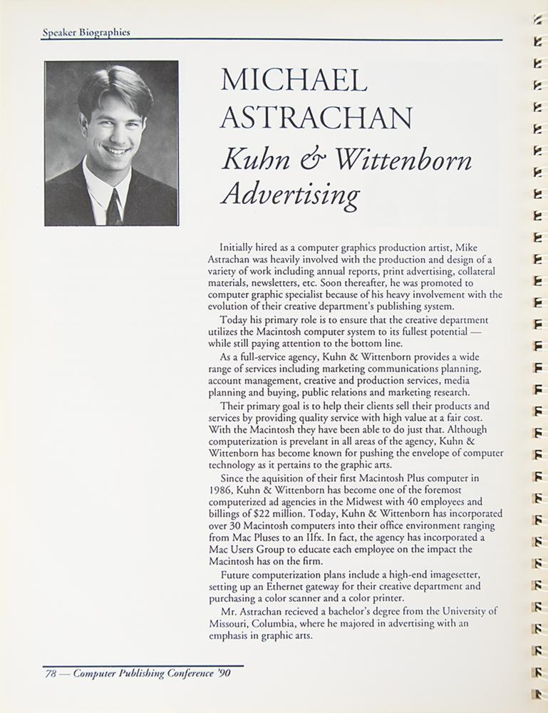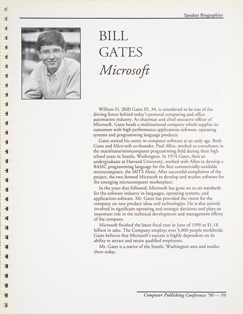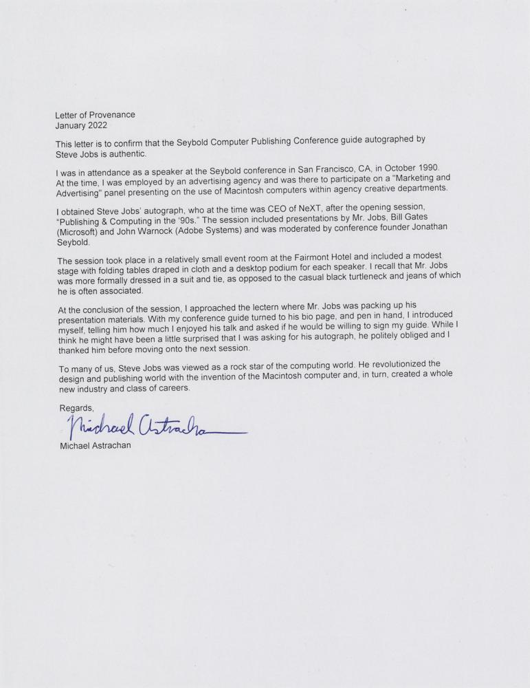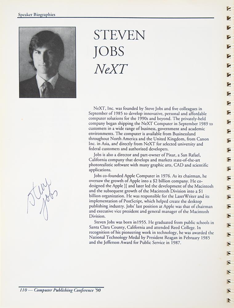 Accompanied by a detailed letter of provenance from Michael Astrachan, in part: "I obtained Steve Jobs' autograph, who at the time was CEO of NeXT, after the opening session?I recall that Mr. Jobs was more formally dressed in a suit and tie, as opposed to the casual black turtleneck and jeans of which he is often associated. At the conclusion of the session, I approached the lectern where Mr. Jobs was packing up his presentation materials. With my conference guide turned to his bio page, and pen in hand, I introduced myself, telling him how much I enjoyed his talk and asked if he would be willing to sign my guide. While I think he might have been a little surprised that I was asking for his autograph, he politely obliged and I thanked him before moving onto the next session. To many of us, Steve Jobs was viewed as a rock star of the computing world. He revolutionized the design and publishing world with the invention of the Macintosh computer and, in turn, created a whole new industry and class of careers."