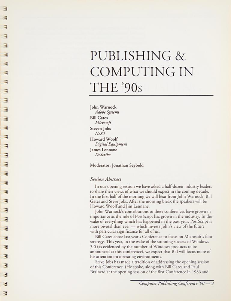 These Seybold Seminars came at a transitional point in the evolution of modern communication, as many traditional printing processes could now be accomplished in the digital realm. Discussions ranged from color calibration and font formats to building efficient publishing workgroup environments. A seminar on color compression excitedly anticipated the introduction of the JPEG standard, which promised to "make desktop color systems a widespread phenomenon." The primary focus was still on print media, though the sessions included two panels on "publishing without paper"-one year before the introduction of the World Wide Web. This book is valuable not just for its rare Steve Jobs autograph, but as a time capsule from a moment of tech-driven upheaval in a centuries-old industry.