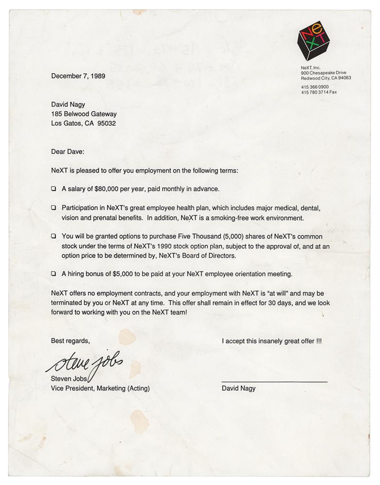 TLS signed "steve jobs," one page, 8.5 x 11, NeXT, Inc. letterhead, December 7, 1989. Letter to David Nagy, who was then working as a product manager at Apple. In part: "NeXT is pleased to offer you employment on the following terms: - A salary of $80,000 per year, paid monthly in advance. - Participation in NeXT's great employee health plan, which includes major medical, dental, vision and prenatal benefits. In addition, NeXT is a smoking-free work environment. - You will be granted options to purchase Five Thousand (5,000) shares of NeXT's common stock under the terms of NeXT's 1990 stock option plan, subject to the approval of, and at an option price to be determined by, NeXT's Board of Directors. - A hiring bonus of $5,000 to be paid at your NeXT employee orientation meeting." Above the line for the recruit's signature (left blank) is typed: "I accept this insanely great offer !!!"—"insanely great" being a famous Jobs-ism used to introduce the Macintosh in 1984. The offer was very unusual in that there was no job title, department, or specific areas of responsibility. In very good condition, with overall creasing and a few light stains.