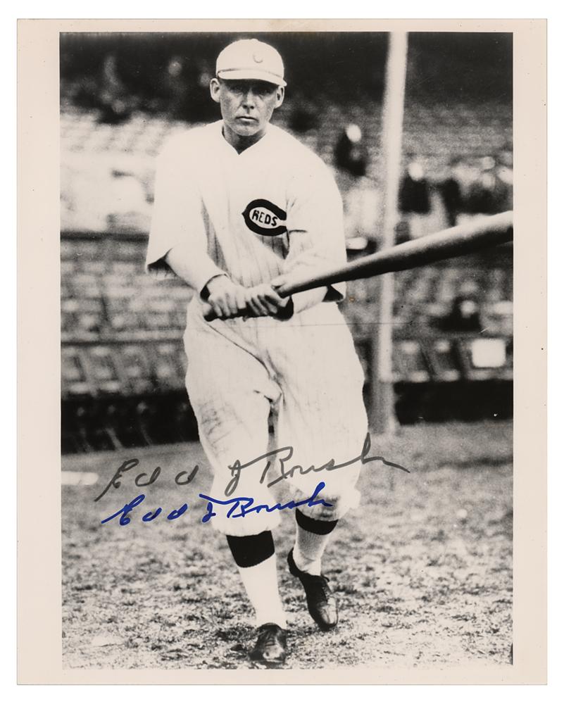 Glossy 8 x 10 full-length photo of Roush in his Cincinnati Reds, signed in blue felt tip, "Edd J. Roush." A pre-printed signature appears above, inherent to the photograph. In fine condition.