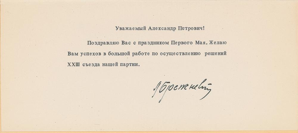 Uncommon May Day greeting card with a glossy gilt image of Moscow's Red Square on the front, measuring 8.25 x 7.5 open, signed inside in ink below a printed greeting in Cyrillic by Brezhnev. In fine condition.