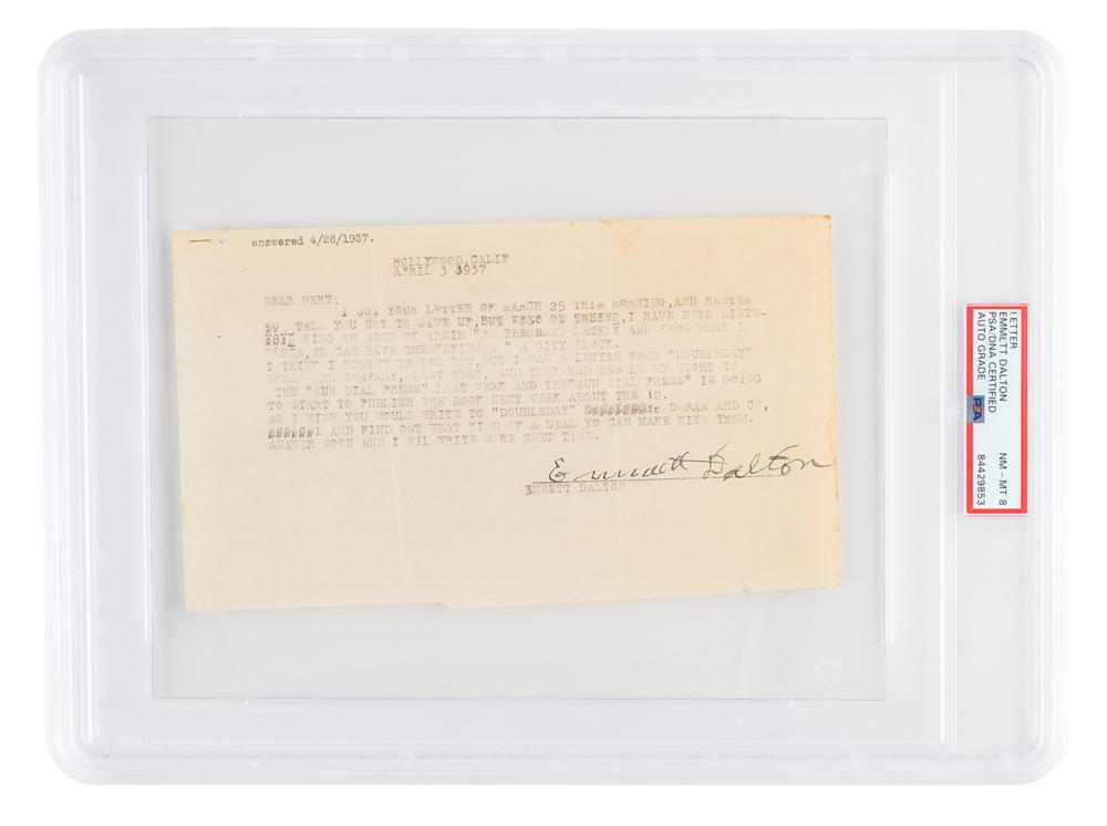 Outlaw and train robber (1871-1937) who was the youngest of the brothers that made up the legendary Dalton Gang of the Old West. He was sentenced to life in prison after an attempted bank robbery in 1892, but was pardoned fourteen years later, after which he became a reformed, respectable member of society. After moving to California to work in real estate, he also embarked on a career in the arts, capitalizing on his notoriety to publish books and begin a career in Hollywood. TLS, one page, 8.5 x 5, April 3, 1937. Letter to "Bert," in part: "I got your letter?and hasten to tell you not to give up, but keep on living, I have been listening to some of their 'programs' lately and from what I hear, we can have them 'skinned' a city block. I think I forgot to tell you, but I had a letter from 'Doubleday' Doran and Company, last week, and they had resold my story to the 'Sun Dial Press' last week and the 'Sun Dial Press' is going to start to publish the book next week." In fine condition. Encapsulated in a PSA/DNA authentication holder, grading the autograph as "NM-MT 8." In 1937, the Sun Dial Press published a reprint of Dalton's book, Dalton's When the Daltons Rode.