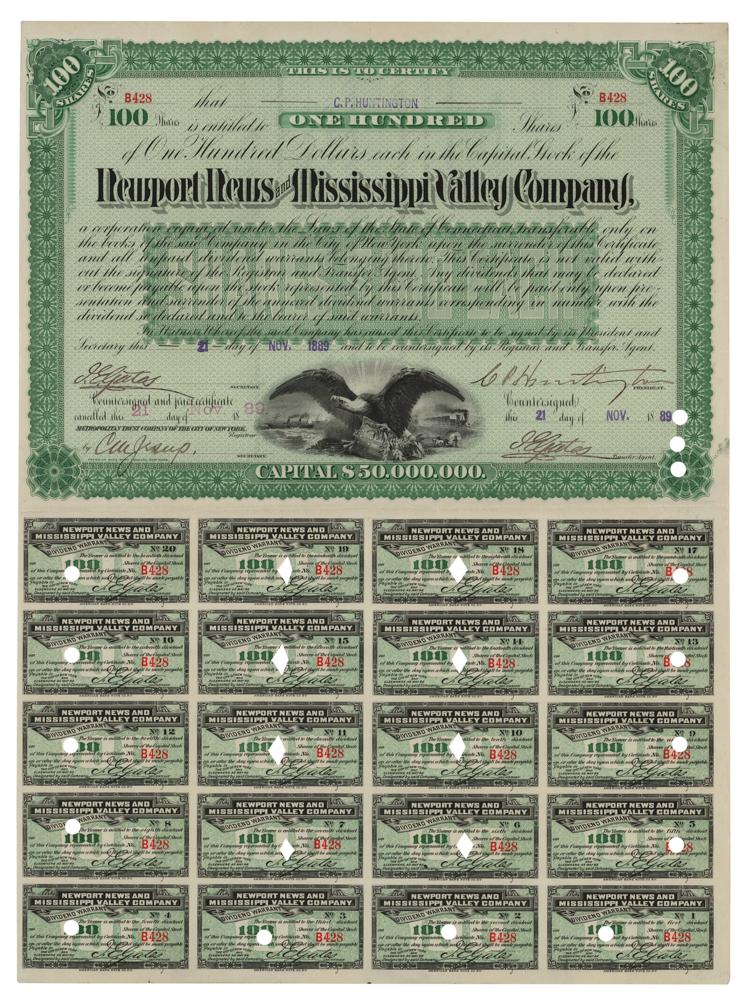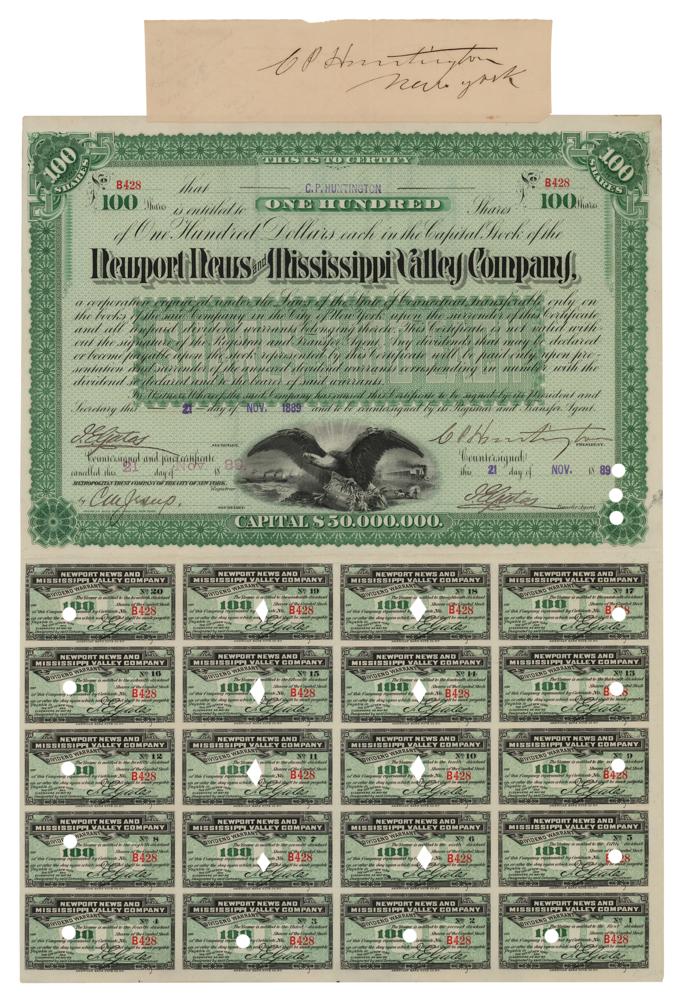 Railroad industrialist (1821-1900) known as one of the 'Big Four' of western railroading. Two items: DS, signed "C. P. Huntington," one page, 11.5 x 8, November 21, 1889, for 100 shares in the Newport News and Mississippi Valley Company, with all twenty dividend warrants intact below; and an ink signature, "C. P. Huntington, New York," on an off-white 7.25 x 1.75 clipped slip. In fine condition.