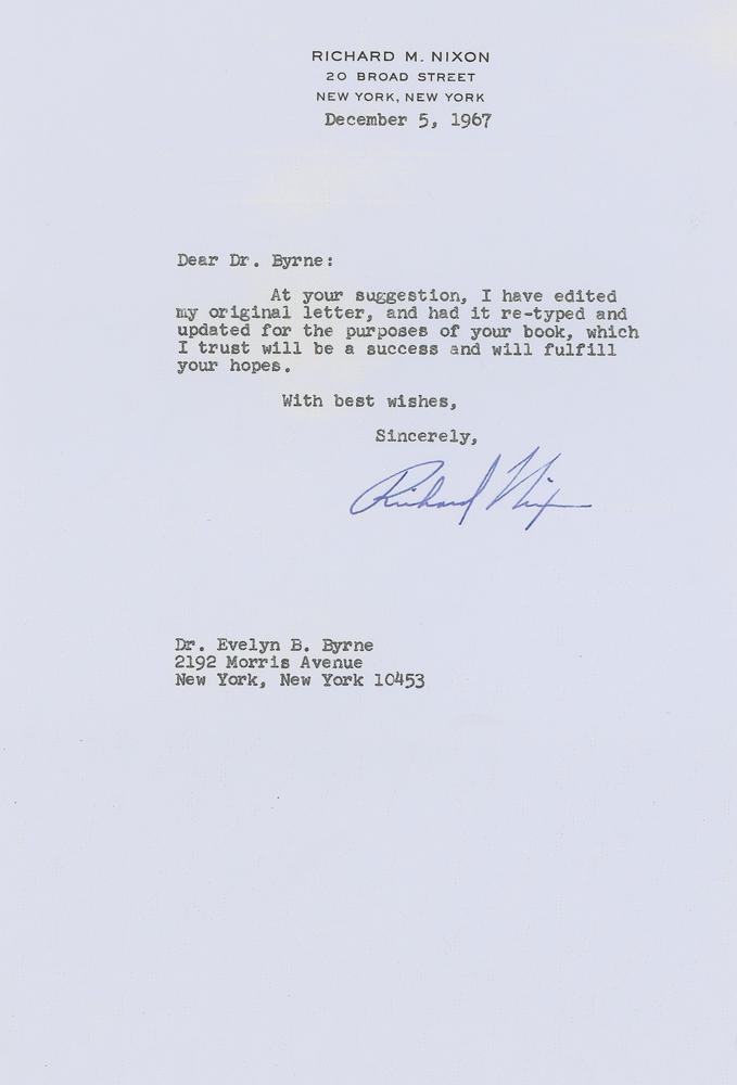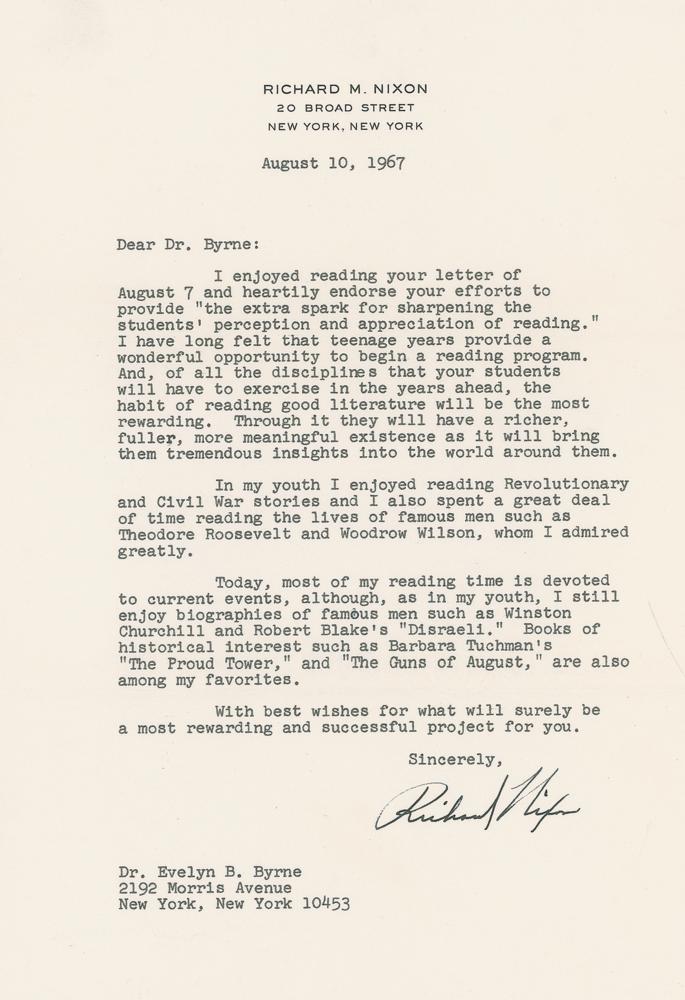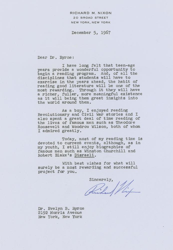 TLS, one page, 7.25 x 10.5, August 10, 1967. Letter to Evelyn Byrne, in part: "Of all the disciplines that our students will have to exercise in the years ahead, the habit of reading good literature will be the most rewarding. Through it they will have a richer, fuller, more meaningful existence as it will bring them tremendous insights into the world around them. In my youth I enjoyed reading Revolutionary and Civil War stories and I also spent a great deal of time reading the lives of famous men such as Theodore Roosevelt and Woodrow Wilson, whom I admired greatly. Today, most of my reading time is devoted to current events, although, as in my youth, I still enjoy biographies of famous men such as Winston Churchill and Robert Blake's 'Disraeli.' Books of historical interest such as Barbara Tuchman's 'The Proud Tower,' and 'The Guns of August,' are also among my favorites." In fine condition. Accompanied by photocopies of Nixon's original cover letter and the edited version of this letter. Byrne ran a program at New York City's Elizabeth Barrett Browning Junior High School where she asked major literary and artistic figures for recollections of what books inspired them; some responses were published in the 1971 book Attacks of Taste.