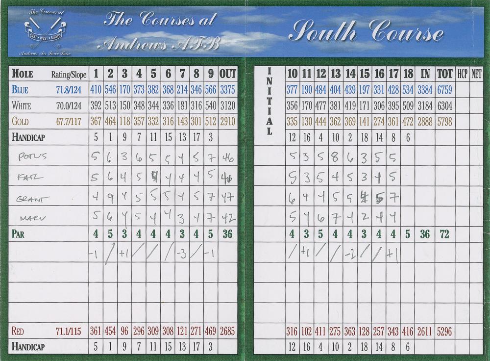 President Barack Obama's tri-fold score card from the South Course at Andrews Air Force Base in Joint Base Andrews, Maryland, measuring 12 x 6, no date, filled out entirely by the president in pencil, who signs in the player field, "POTUS," and tracks the score for his three playing partners-"Katz," "Grant," and "Marv"-over 17 played holes. In fine condition.