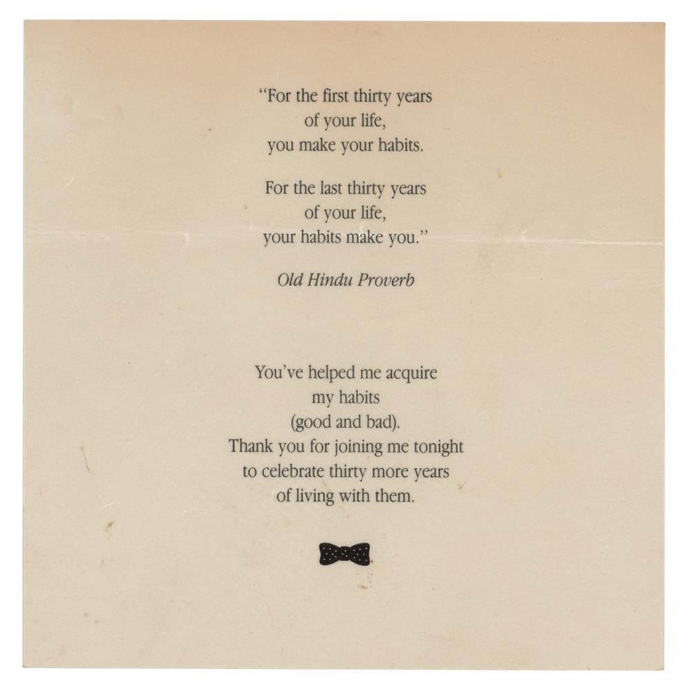 Rare table card from Steve Jobs's 30th birthday celebration at the St. Francis Hotel in San Francisco on February 23, 1985, which derives from the personal collection of a close friend and former high school classmate of the Apple co-founder, who was one of a select few to sit with Jobs at his table during the birthday celebration. The cream-colored sheet, 5.5 x 5.5, features an "Old Hindu Proverb" above a sentiment of appreciation from Jobs; they read: "'For the first thirty years of your life; you make your habits. For the last thirty years of your life, your habits make you," and "You've helped me acquire my habits (good and bad). Thank you for joining me tonight to celebrate thirty more years of living with them." A small black bow tie with white polka dots is printed at the bottom. In fine condition, with a horizontal fold, and faint evidence on the back from onetime storage in a magnetic photo album.