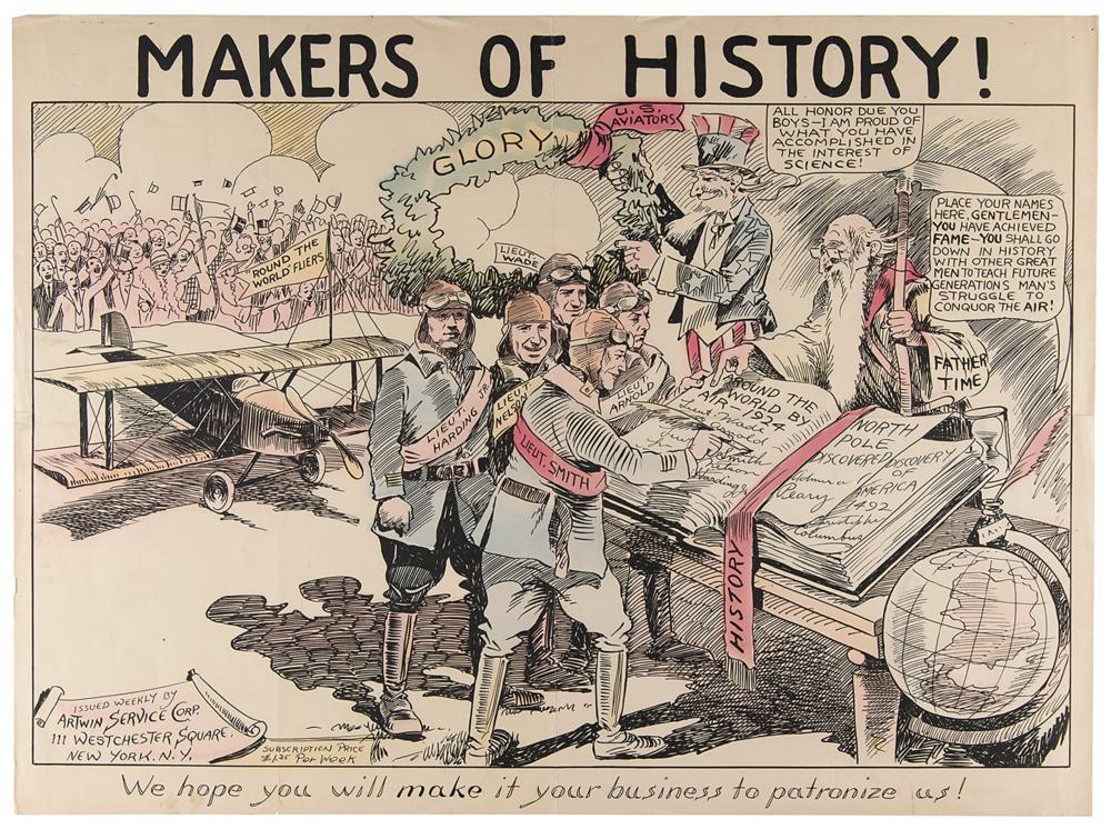 Scarce circa 1924 color 26.5 x 19.75 poster published as part of a weekly series by Artwin Service Corp. of New York, entitled "Makers of History!," portraying the 'round-the-world fliers' signing the guestbook of Father Time as Uncle Sam bestows laurels upon them. The cartoon places these aviators—Lowell Smith, Erik Nelson, Leigh Wade, Leslie Arnold, and John Harding—amidst the likes of Admiral Peary ('North Pole Discovered') and Christopher Columbus ('Discovery of America 1492') in Father Time's log of history. In fine condition, with intersecting folds and some light border creasing.