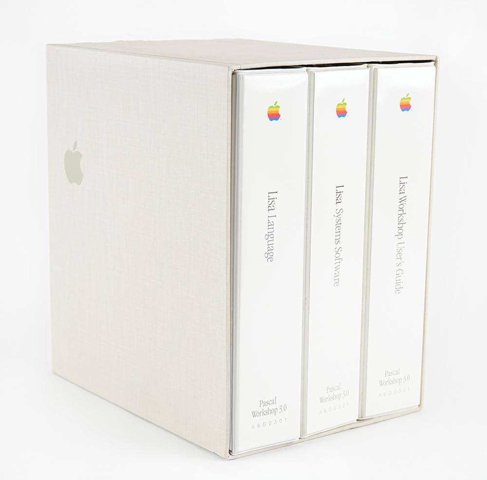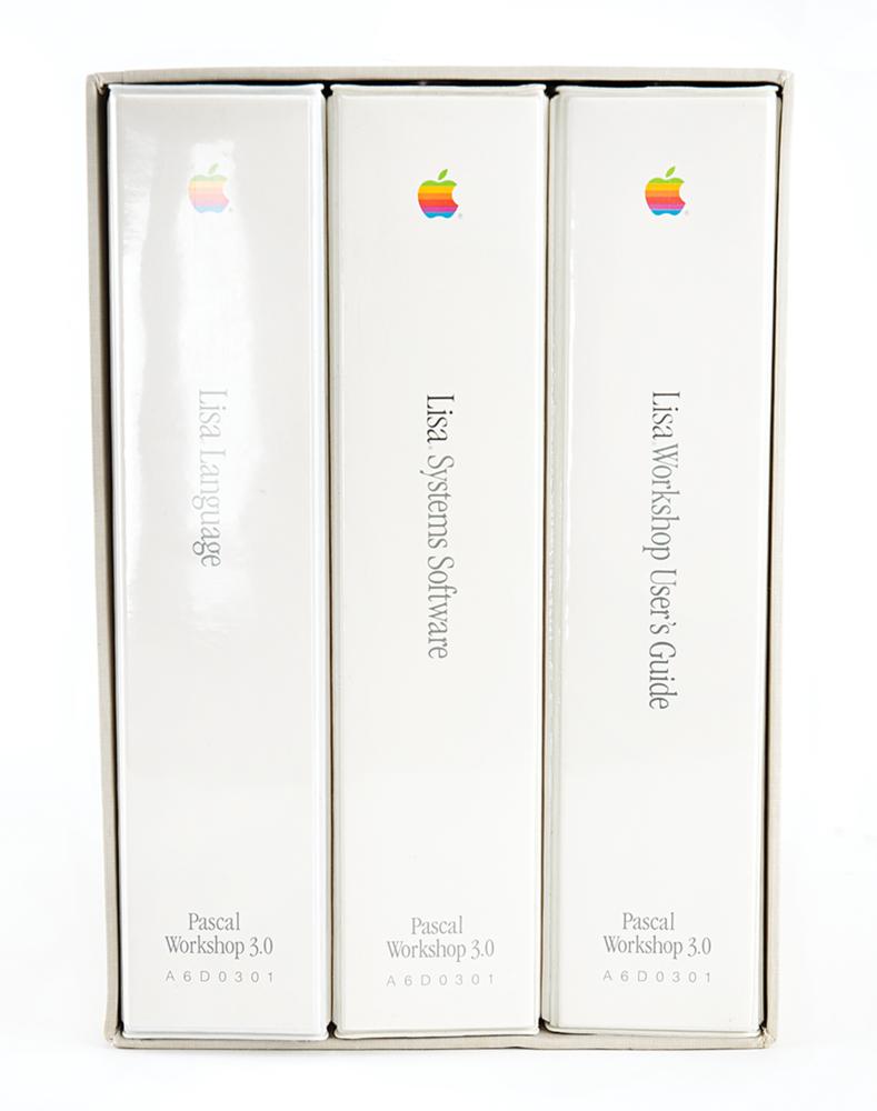 Uncommon factory-sealed Apple Lisa Pascal Workshop 3.0 software and reference material, comprising three binders housed in their original slipcase. The binders are labeled "Lisa Systems Software," "Lisa Language," and "Lisa Workshop User's Guide," with sealed contents including the right floppy discs for "Lisa Pascal Workshop 3.0," plus reference notes and user guides: "Release 3.0 Notes," "Lisa Pascal 3.0 Systems Software," "Workshop 3.0 Release Notes," "Developer's Handbook," "Workshop User's Guide for the Lisa," "Release 3.0 Notes for the Pascal Reference Manual for the Lisa," "Pascal Reference Manual," and "Motorola M68000 16/32-Bit Microprocessor Programmer's Reference Manual." The exterior slipcover is worn with a few edge tears, but the inner contents remain in fine, unused condition.