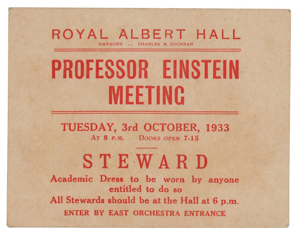 Rare 4.5 x 3.5 steward's admission pass for the "Professor Einstein Meeting" held at the Royal Albert Hall on October 3, 1933, imprinted with instructions: "Academic Dress to be worn by anyone entitled to do so, All Stewards should be at the Hall at 6 p.m." Held just a few months after the Nazis' rise to power in Germany, this was Albert Einstein's last public appearance before leaving Europe. In the address, he spoke on the subjects of academic freedom and the dangers faced by the intelligentsia under the new regime in Germany. Other speakers at the meeting were physicist and Nobel Prize winner Lord Ernest Rutherford; leading anti-Nazi politician and Nobel Prize winner Sir Joseph Austen Chamberlain; preacher and suffragist Dr. Maude Royden; and leading economist and social reformer Sir William Beveridge. In fine condition.