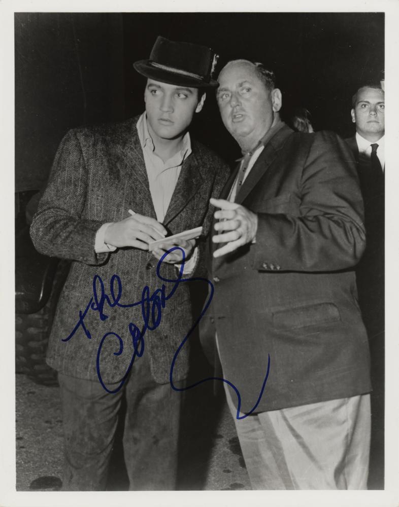 Glossy 8 x 10 photo of Elvis Presley with his manager Colonel Tom Parker, signed in blue felt tip by Parker, "The Colonel." In fine condition. Originally obtained by in-person specialist Mike Wehrmann.
