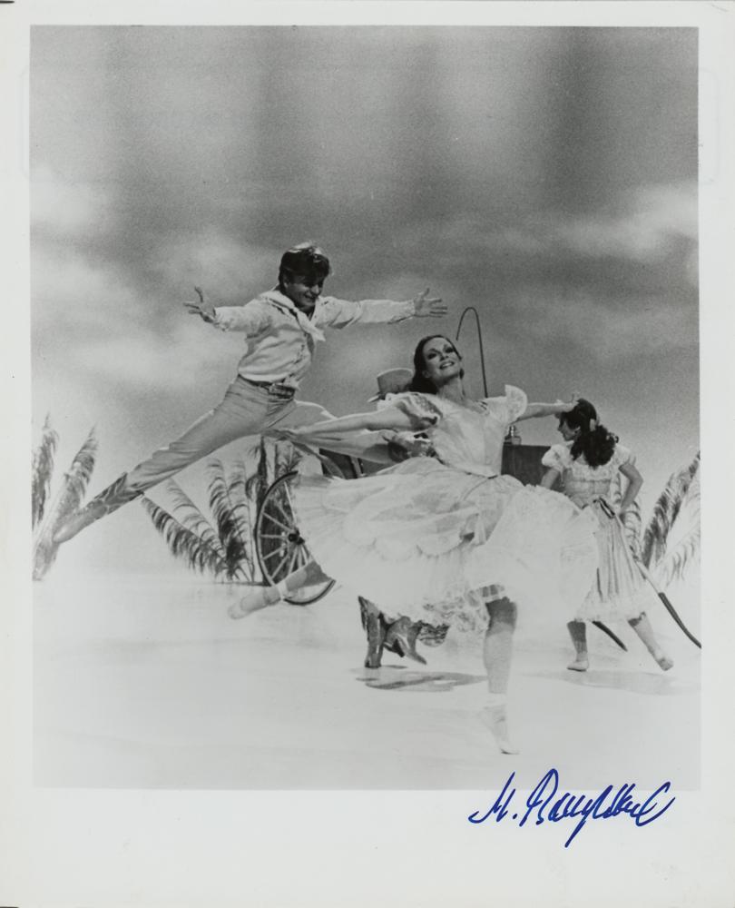 Glossy 8 x 10 photo of Baryshnikov making a dramatic leap on stage, signed in blue felt tip, "M. Baryshnikov." In fine condition. Originally obtained by in-person specialist Mike Wehrmann.