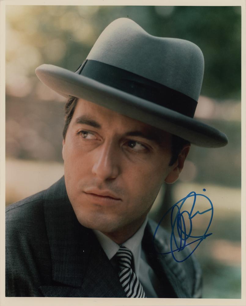 Color satin-finish 8 x 10 photo of Al Pacino in his iconic role as Michael Corleone in The Godfather Part II, signed in blue felt tip. In very fine condition. Originally obtained by in-person specialist Mike Wehrmann.