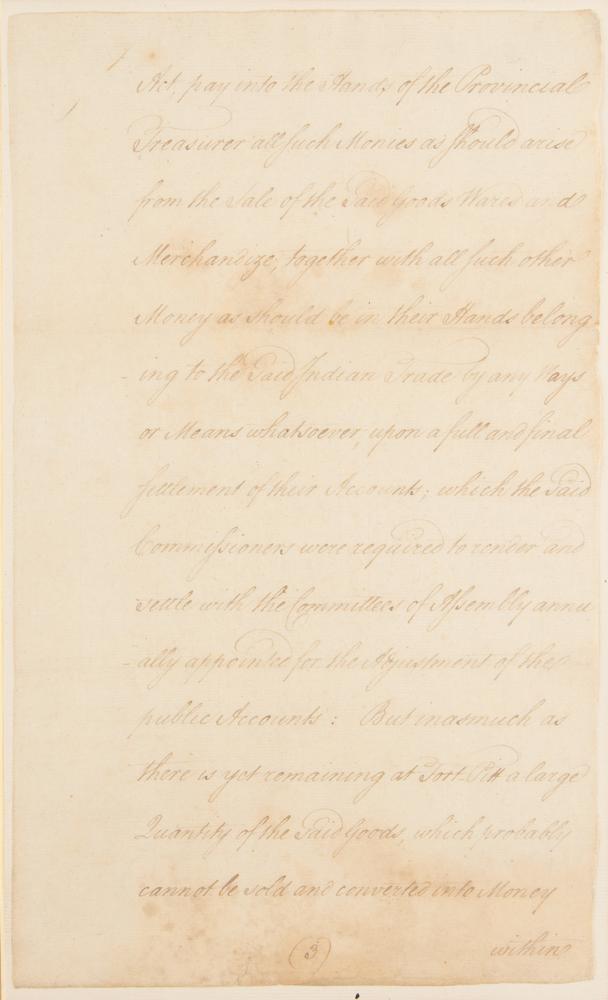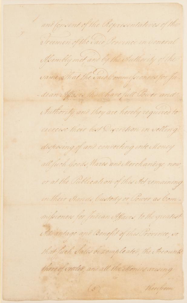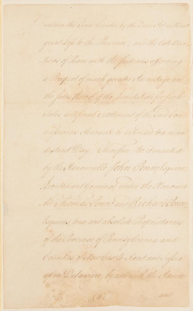 The document reads, in part: "Whereas by an Act of Assembly passed in the third year of His Majesty's reign [entitled above]?the Commissioners for Indian Affairs are enjoined and required with all convenient Speed, and at farthest within the Space of Eighteen Months from the Publication of the Said Act, to sell, dispose of, and convert into Money all and every Part of the Goods, Wares and Merchandize in their Hands, Custody or Power, by them purchased with certain Monies borrowed by Virtue of another Act of General Assembly of this Province from the Trustees of the General Loan Office, or otherwise howsoever in their Possession as Commissioners for Indian Affairs: And that the Said Commissioners should with all convenient Speed, and at farthest within the Grace of eighteen Months from the Publication of the said Act, pay into the Hands of the Provincial Treasurer all Such Monies as Should arise from the Sale of the Said Goods, Wares and Merchandize, together with all such other Money as should be in their Hands belonging to the Said Indian Trade by any Ways or Means whatsoever, upon a full and final settlement of their Accounts; which the Said Commissioners were required to render and settle with the Committee of Assembly annually appointed for the Adjustment of the public Accounts: But inasmuch as there is yet remaining at Fort Pitt a large Quantity of the said Goods, which probably cannot be sold and converted into Money within the Time limited by the Said Act without great Loss to the Province; and the late Overtures of Peace with the Indians affording a Prospect of much greater Advantage in the Sales thereof if the Limitation for such Sales, and final Settlement of the said Commissioners Accounts be extended to a more distant Day; Therefore Be it enacted by the Honourable John Penn, Esquire, Lieutenant Governor under the Honourable Thomas Penn and Richard Penn, Esquires, true and absolute Proprietaries of the Province of Pennsylvania and Counties of New Castle, Kent, and Sussex upon Delaware, by and with the Advice and Consent of the Representatives of the Freemen of the Said Province in General Assembly met, and by the Authority of the same That the Said Commissioners for Indian Affairs shall have full Power and Authority, and they are hereby required to exercise their best Discretion in selling, disposing of and converting into Money all Such Goods, Wares and Merchandize, now, or at the Publication of this Act, remaining in their Hands, Custody or Power as Commissioners for Indian Affairs, to the greatest Advantage and Benefit of this Province, so that Such Sales be completed, the Accounts thereof settled, and all the Monies arising therefrom, paid into the Hands of the Said Provincial Treasurer on, or before the first Day of September, which will be in the Year One Thousand Seven Hundred and Sixty five, as the same shall all come into their Hands anything in the Said Act of Assembly to the Contrary thereof in any wise notwithstanding." The document has been professionally affixed inside a custom-made leatherbound presentation folder, which also contains the document's original embossed seal with faded red ribbon. In very good to fine condition, with light staining, professional repairs to small areas of paper loss, and expert silking to reinforce both sides of each page.