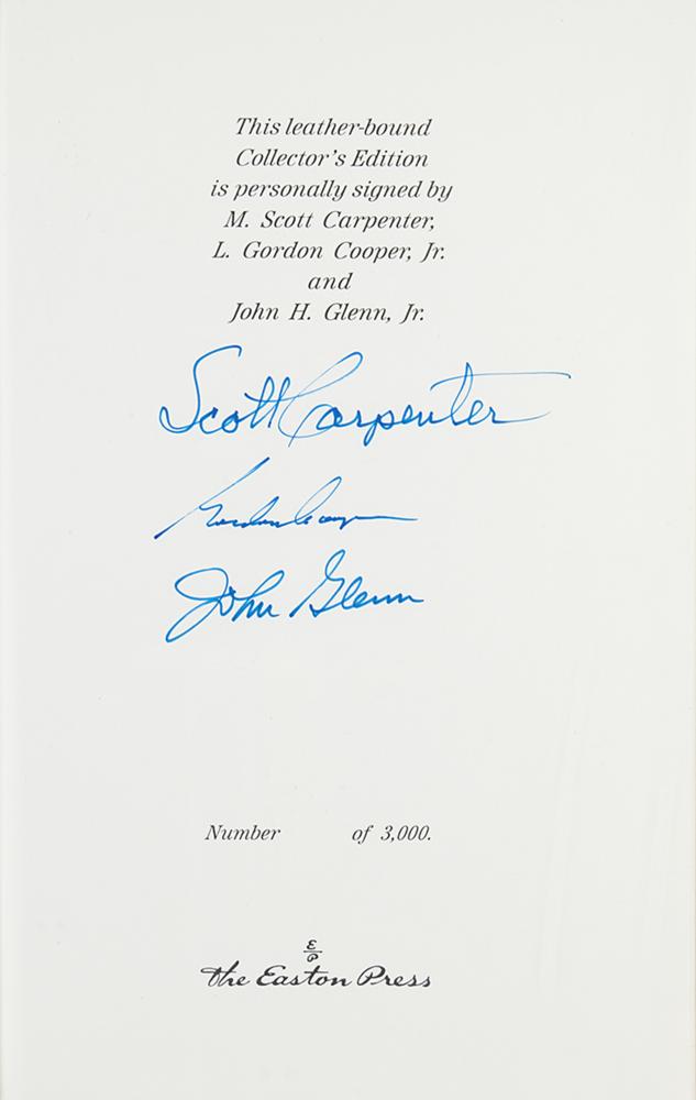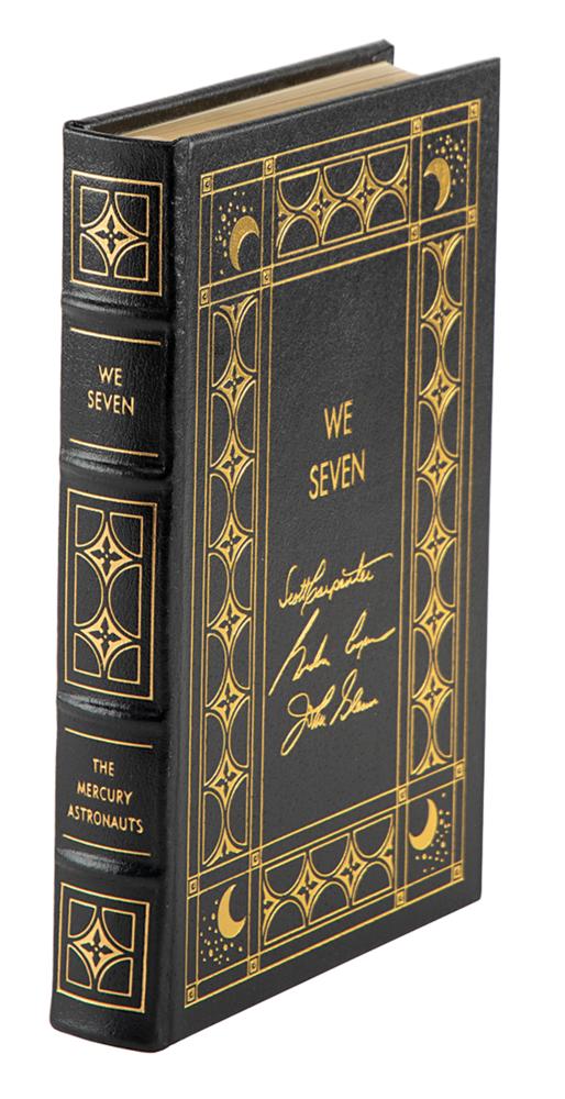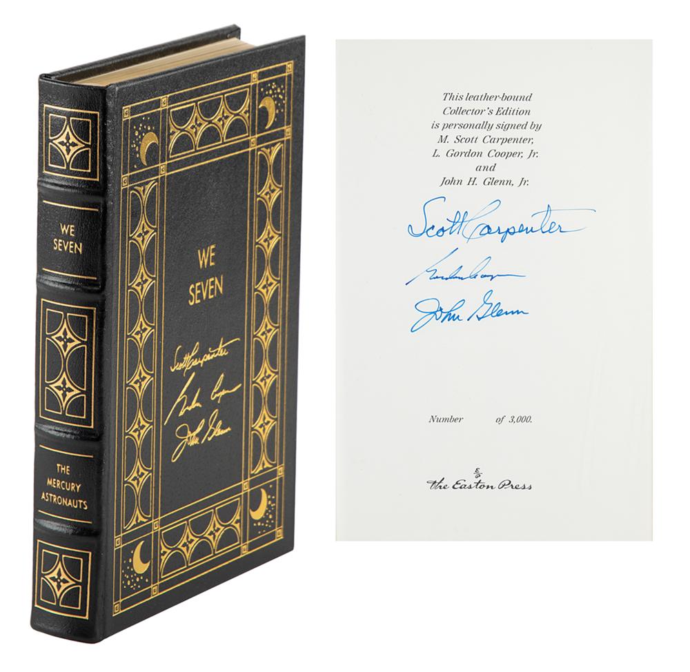 Signed book: We Seven. Limited special collector's edition, 3000 issued (one of 25 unnumbered author copies). Connecticut: Easton Press, 1990. Leather-bound hardcover, 6.25 x 9.25, 352 pages. Signed in blue ink on the colophon by John Glenn, Scott Carpenter, and Gordon Cooper. Includes an eight-page souvenir typescript of Deke Slayton's chapter entitled "A Standing Start," signed on the last page in black ballpoint, "DK Slayton." In overall fine condition.