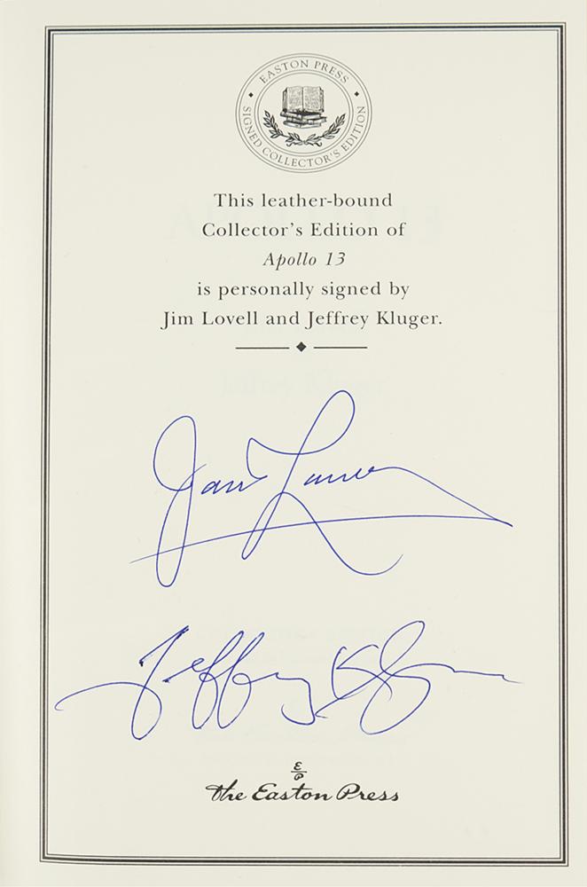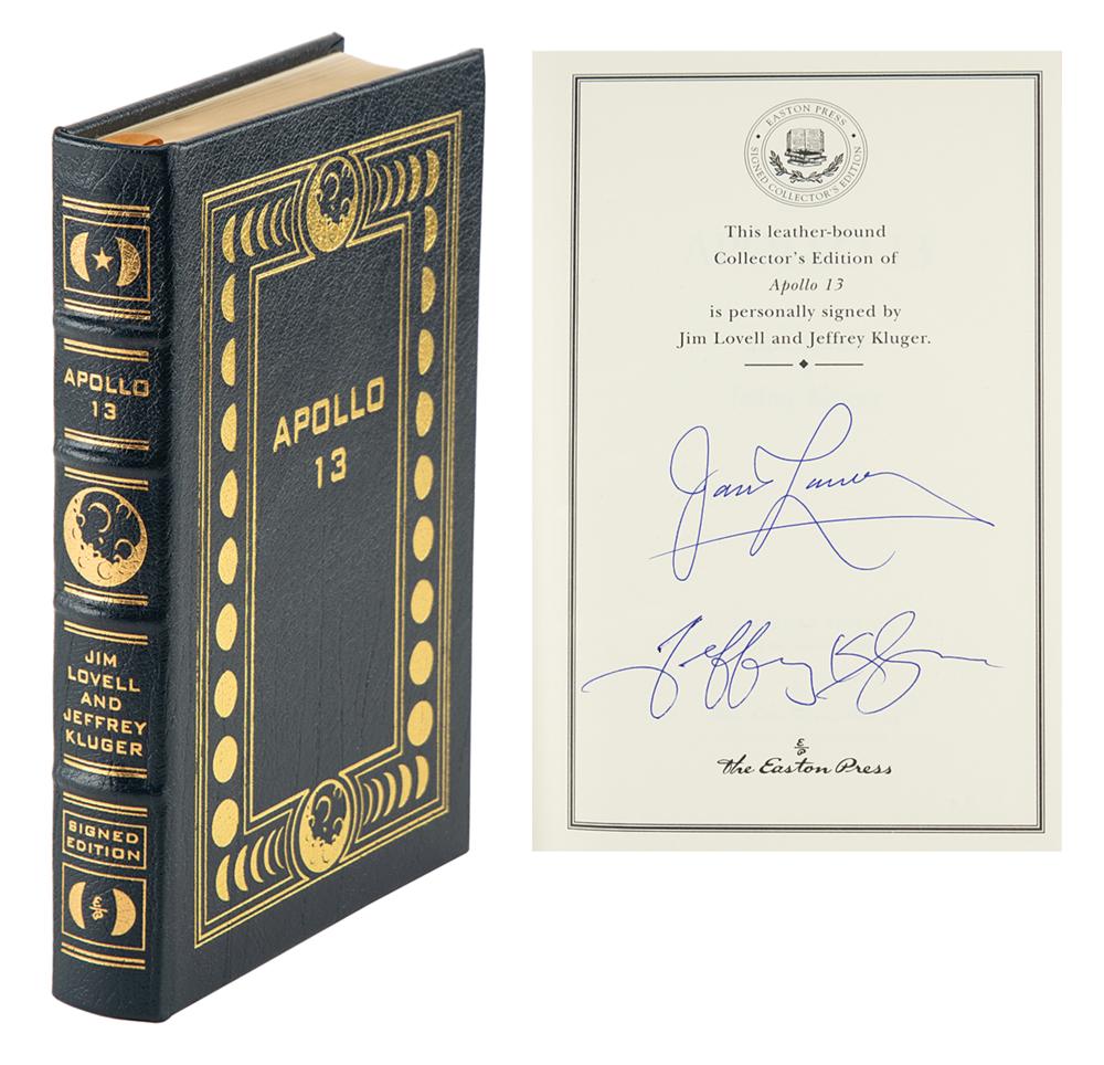 Signed book: Apollo 13. Collector's edition. Norwalk, CT: Easton Press, 2005. Leather-bound hardcover, 6.25 x 9.25, 378 pages. Signed on the colophon in blue ink by James Lovell and Jeffrey Kluger. In very fine condition. Accompanied by the publisher's certificate of authenticity.