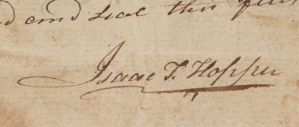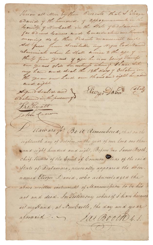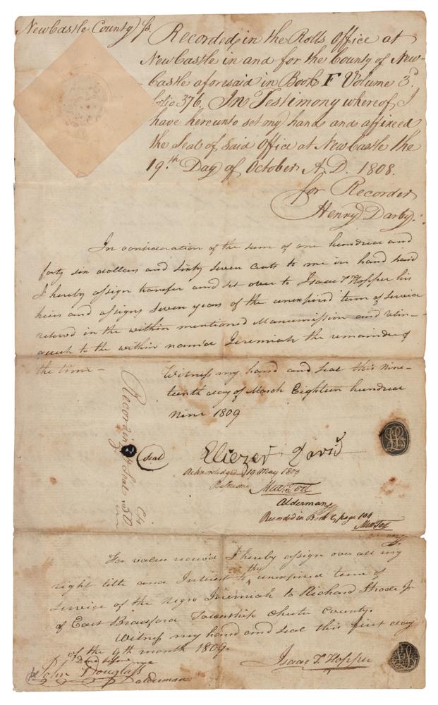 American abolitionist (1771-1852) who was active in Philadelphia in the anti-slavery movement and protecting fugitive slaves and free blacks from slave kidnappers. He was also co-founder of Children's Village with 23 others. Manuscript DS, signed "Isaac T. Hopper," one page both sides, 7.75 x 12.75, September 1, 1809. Manumission document related to a "negro lad named Jeremiah," which begins with current owner Eliezer David asserting that the former will be set free "when he shall come to the age of thirty five years, he now being twenty one." David, on the reverse, then for "the sum of one hundred and forty six dollars and sixty seven cents," assigns and transfers to Isaac T. Hopper "seven years of the unexpired term of service referred in the within mention manumission and relinquish to the within named Jeremiah the remainder of the time." At the conclusion, Hopper then proceeds to assign all right, title, and interest of Jeremiah's unexpired term of service "to Richard Strode, Jr., of East Bradford Township Chester County." Signed neatly along the bottom by Hopper, with the front also countersigned by James Booth, Sr., who served as the Secretary of State of Delaware (1778-1799) and the Delaware Supreme Court Chief Justice (1799-1828). In fine condition, with scattered light stains.