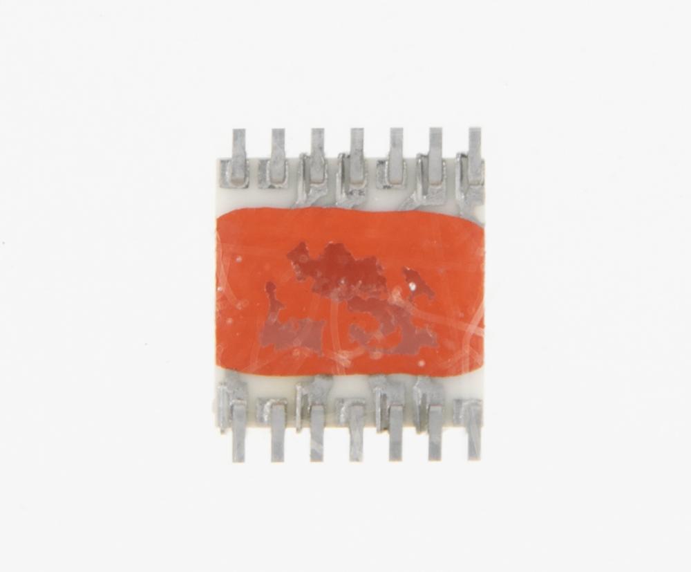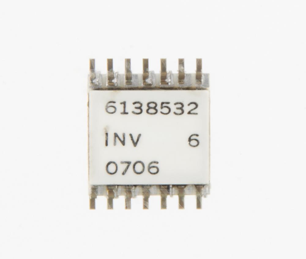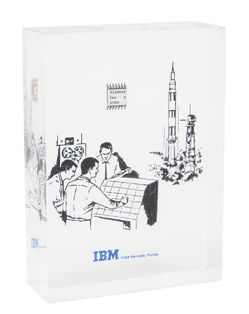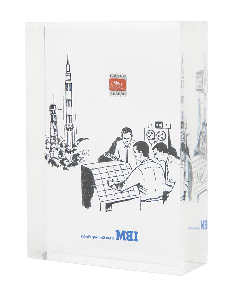 An IBM gold and ceramic flat-pack integrated circuit chip, .25" x .25", contained in a Lucite paperweight display measuring 2.75" x 3.75" x 1", with images of the Saturn V moon rocket at launch, and three computer personnel overlooking an IBM model 7090 Saturn flight simulation computer with an IBM magnetic tape storage unit shown behind them. This chip has been identified as a ULD (unit logic device), which is part of the Page Assembly Cards of the LVDC (launch vehicle digital computer) used in the Saturn V Instrument Unit; these were typical of the types of Military Grade Integrated Circuits that were used in the IBM model 7090 Saturn flight simulation computer for the NASA Apollo moon missions. In fine condition, with light wear to Lucite.