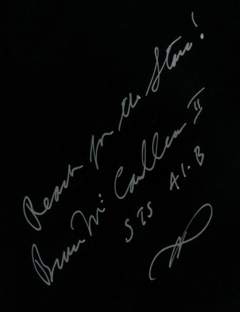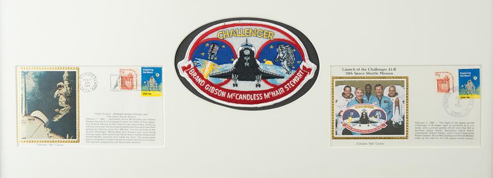 Large color glossy 15.75 x 18 photo of McCandless floating high above the Earth during his historic first untethered free flight, signed in silver ink, "Reach for the stars! Bruce McCandless II, STS 41-B." Double-matted and framed with a Challenger patch and two covers to an overall size of 24 x 32. In fine condition.