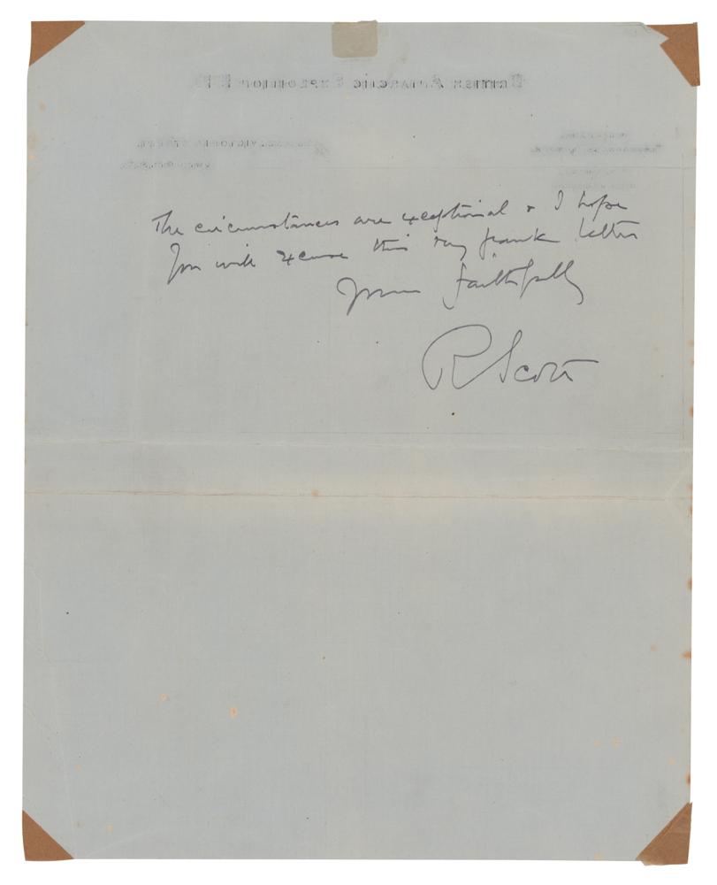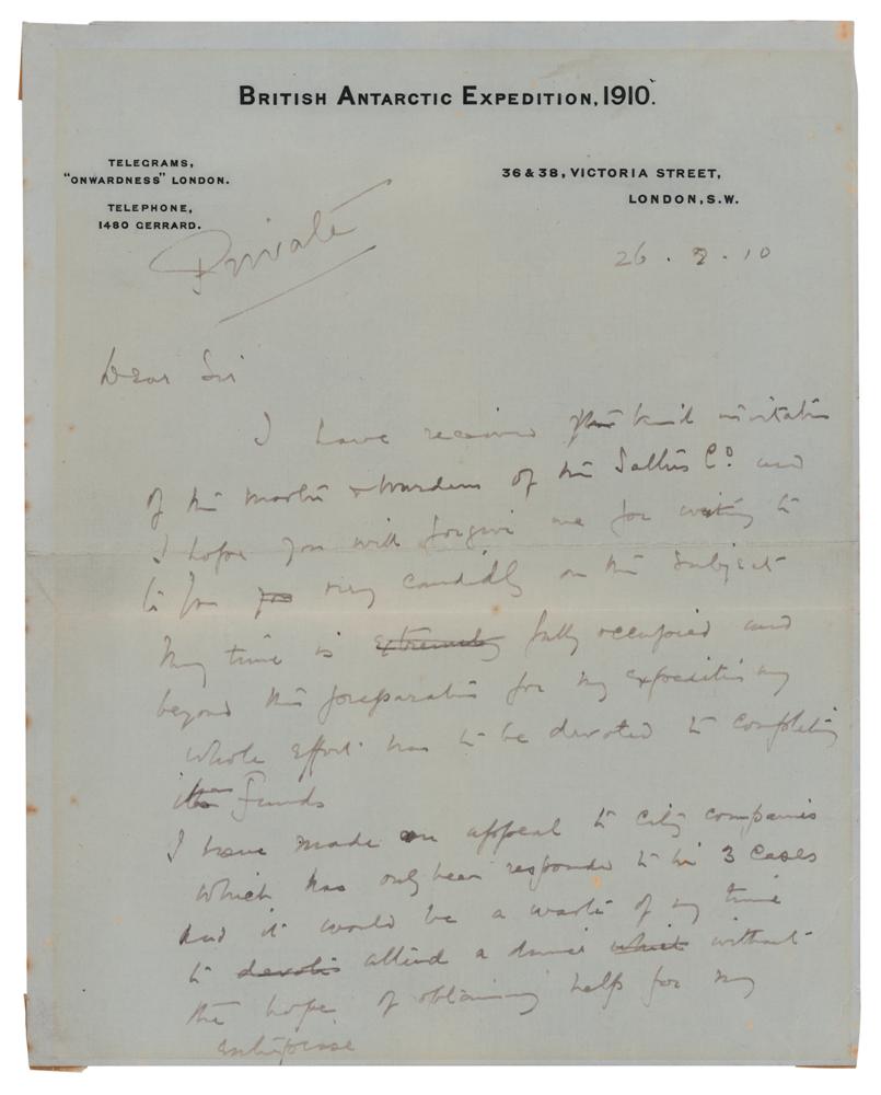British naval officer and explorer (1868-1912) best known for the two expeditions he led to the Antarctic, the Discovery Expedition and the ill-fated Terra Nova Expedition. ALS signed "R. Scott," one page both sides, 8 x 10, British Antarctic Expedition 1910 letterhead, August 26, 1910. Handwritten letter to a gentleman, marked "Private," in part: "I have received your kind invitation?I hope you will forgive me for writing to you candidly on this subject. My time is fully occupied and beyond the preparation for my expedition my whole effort has to be devoted to completing funds. I have made an appeal to City Companies which has only been responded to in 3 cases and it would be a waste of my time to attend a dinner without the hope of obtaining help for my enterprise." In very good to fine condition, with trimmed edges, two short edge tears, toning from prior display, and old mounting remnants to the corners of the signed page.