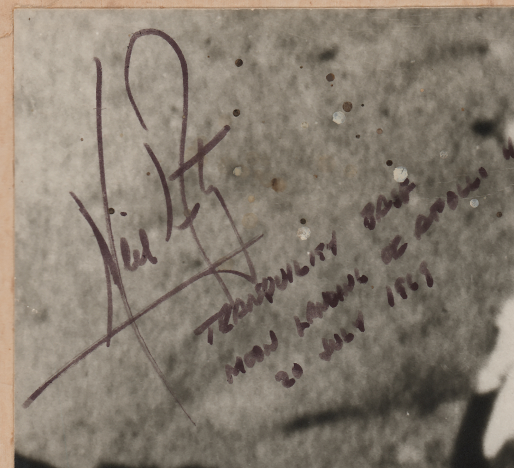Amazingly rare and historic vintage matte-finish 9.5 x 7.5 photo of astronauts Neil Armstrong and Buzz Aldrin raising the United States flag at the Apollo 11 lunar landing site, signed in felt tip by the entire crew: "Neil Armstrong, Tranquility Base, Moon Landing of Apollo 11, 20 July 1969," "Buzz Aldrin," and "M. Collins." Affixed to an 11 x 11 cardstock mount, with affixed caption below. In very good to fine condition, with some creasing and foxing to the mount, and small scattered stains near Armstrong's signature; the autographs of both Armstrong and Aldrin are clear and bold, while the Collins signature has faded to a somewhat indistinct orange color.