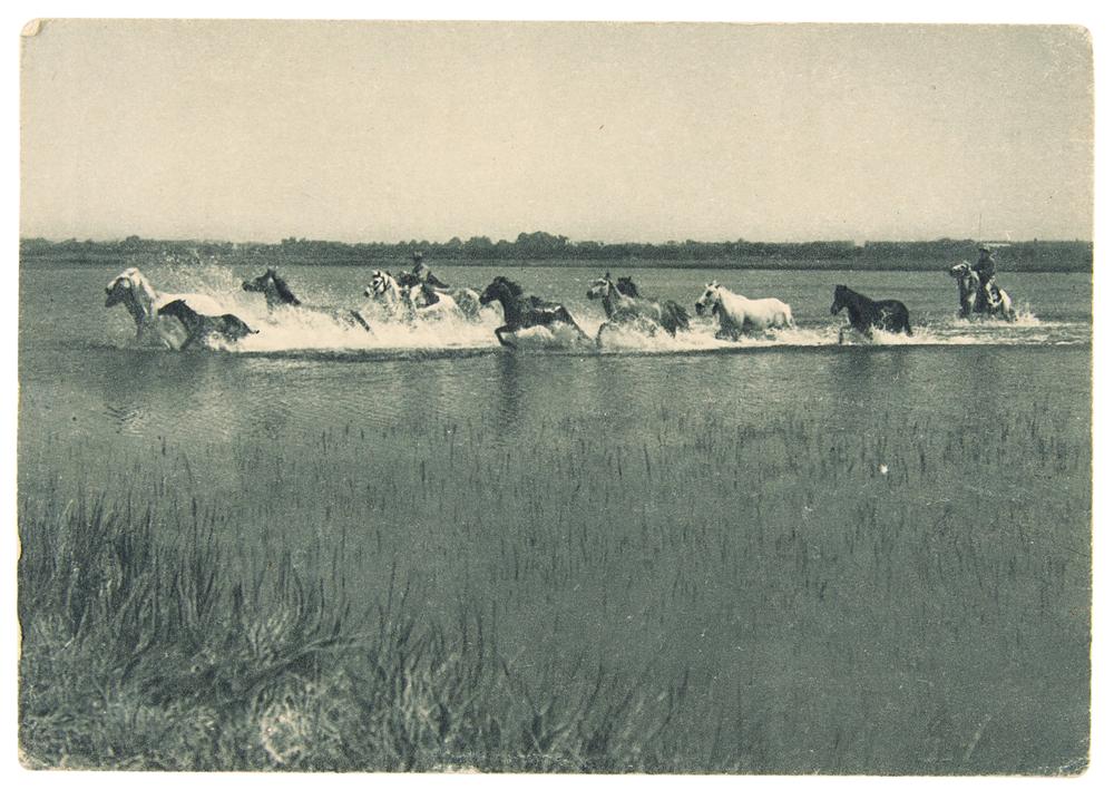 Exquisite signed ink sketch of a bull accomplished by Pablo Picasso on the reverse of a 6 x 4 postcard depicting horses in Provence et Camargue, boldly titled and signed in ink, "20.10.1957, Man v. Toro, Picasso,” playing off the name of the recipient, the important Dada/Surrealist photographer Man Ray. Also signed in ink by Jacqueline Roque (his second wife), Eduoard Pignon (French artist), Hélène Parmelin (French journalist), Roland (likely artist and art collector Roland Penrose), and one other. Addressed to Man Ray at his studio, "2 bis Rue Ferou, Paris." In fine condition, with a small stain touching the date.