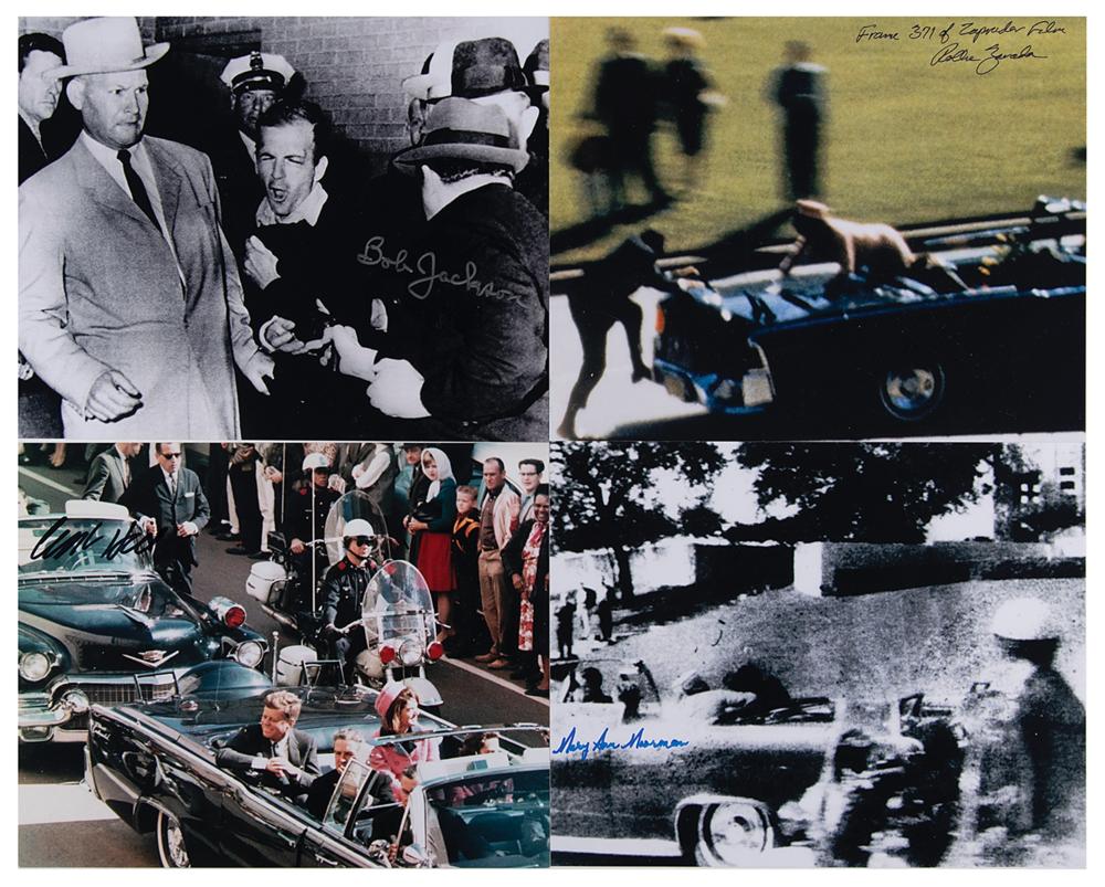 Four different satin-finish 10 x 8 photos associated with the assassination of President John F. Kennedy: one of the Kennedys happily riding in the presidential limousine, signed in black felt tip by Secret Service agent Clint Hill; one from the film captured by Abraham Zapruder, signed in black felt tip by the Kodak expert who consulted with the Assassination Records Review Board, "Frame 371 of Zapruder Film, Rollie Zavada"; the image taken seconds after the shooting by witness Mary Moorman, signed in black felt tip, "Mary Ann Moorman"; and a photo of Jack Ruby shooting Lee Harvey Oswald, signed in silver ink by the photographer, "Bob Jackson." In overall fine condition.