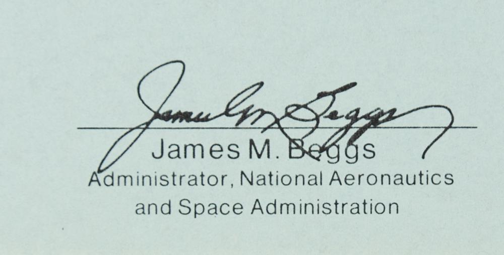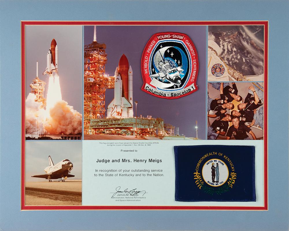 Official NASA presentation featuring a flown 5.5 x 4 Kentucky state flag and a flown 4 x 4.5 mission patch carried aboard the Space Shuttle Columbia on STS-9, both affixed to a display containing five photos from the mission and a certificate, which reads: "This flag and patch were flown aboard the Space Shuttle Columbia (STS-9) during the mission of Spacelab 1. Nov. 28-Dec. 8, 1983. Presented to Judge and Mrs. Henry Meigs, In recognition of your outstanding service to the State of Kentucky and to the Nation." Certificate bears a preprinted signature of NASA Administrator James M. Beggs. Double-matted to an overall size of 20 x 16. In fine condition.
