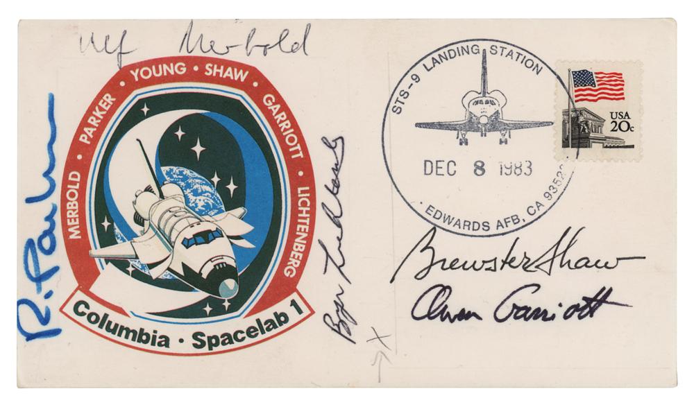 Commemorative cover with a color cachet of the STS-9 or Spacelab 1 mission insignia, postmarked at Edwards Air Force Base on the mission landing date of December 8, 1983, signed in ink and felt tip by all crew members except for John Young-Brewster Shaw, Owen K. Garriott, Robert Parker, Ulf Merbold, and Byron Lichtenberg. In fine condition. Accompanied by a full letter of authenticity from Zarelli Space Authentication.