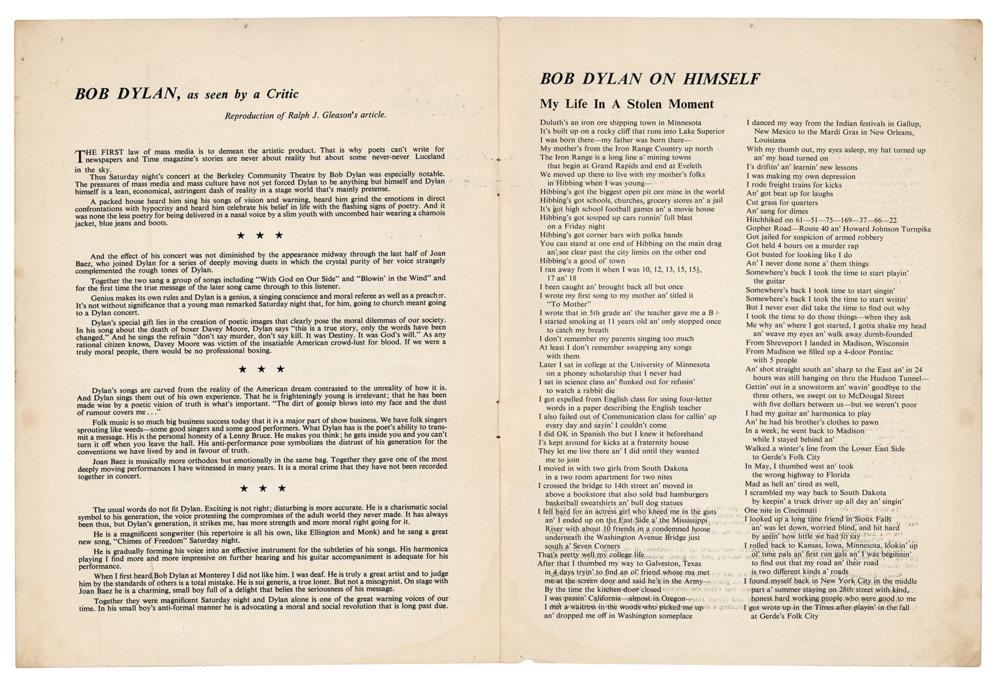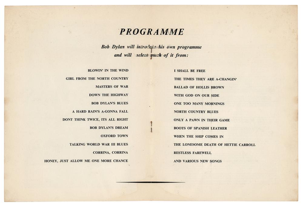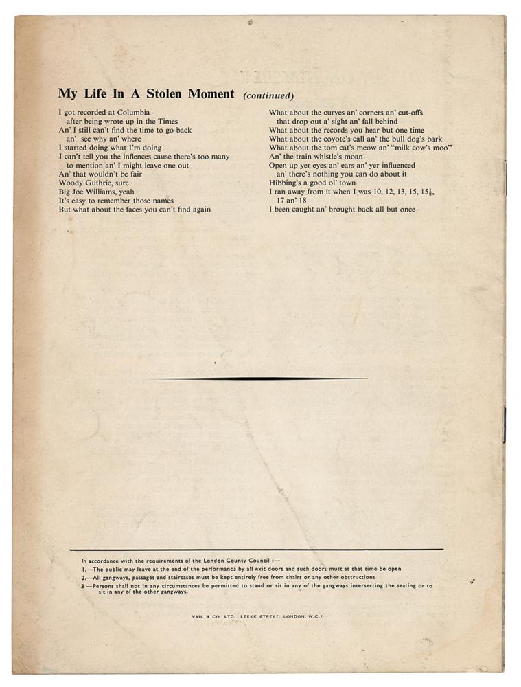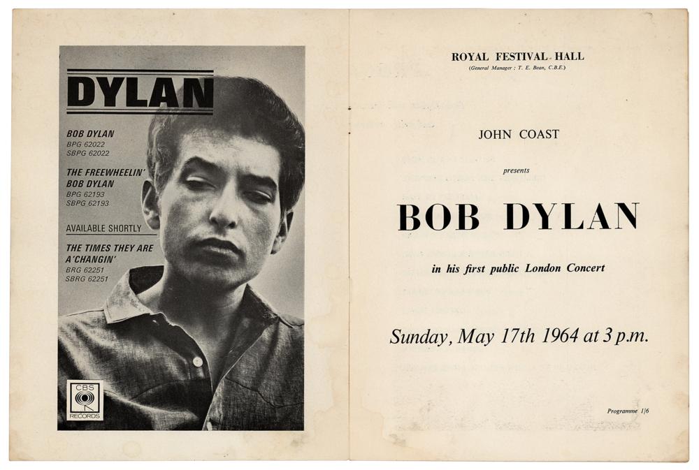 Original program for Bob Dylan's first public concert in London, England, held at the Royal Festival Hall on May 17, 1964, four pages, 7.5 x 9.75, with the interior featuring Dylan's poem 'My Life in a Stolen Moment,' a reproduction of Ralph J. Gleason's article 'Bob Dylan, as seen by a Critic,' and a large list of songs from which Dylan selected his set list: "Bob Dylan will introduce his own programme and will select much of it from." Dylan ended up playing 18 songs that night, including 'The Times They Are A-Changin',' 'Who Killed Davey Moore?,' 'Chimes of Freedom,' 'Mr. Tambourine Man,' and 'A Hard Rain's A-Gonna Fall.' In very good to fine condition, with creasing and handling wear.
