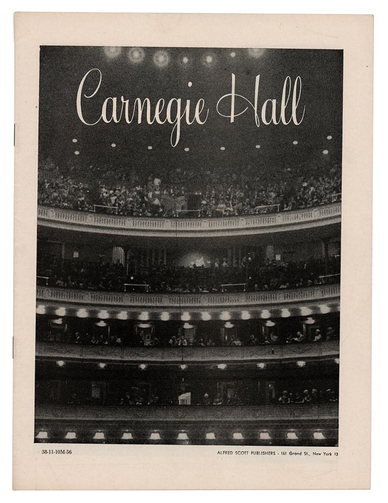 Desirable original program for Billie Holiday's legendary two-show performance at Carnegie Hall in New York City, on November 10, 1956, 22 pages, 7.75 x 10.25, with the main program page listing shows at 8:30 p.m. and midnight for "Lady Sings the Blues, The Songs and Story of Miss Billie Holiday," which lists the Chico Hamilton Quintet, an intermission, and then Holiday's performance with narration by Gilbert Millstein of The New York Times, who, in between songs, read aloud four lengthy passages from Holiday's autobiography, Lady Sings the Blues. Holiday's supporting musicians are named on page 15: Coleman Hawkins, Buck Clayton, Roy Eldridge, Al Cohn, Kenny Burrell, and Carl Drinkered. In fine condition.