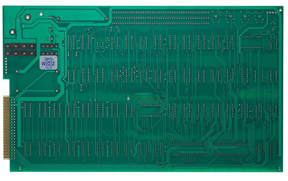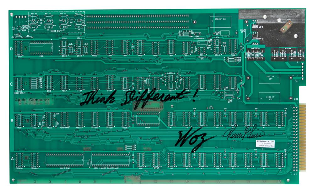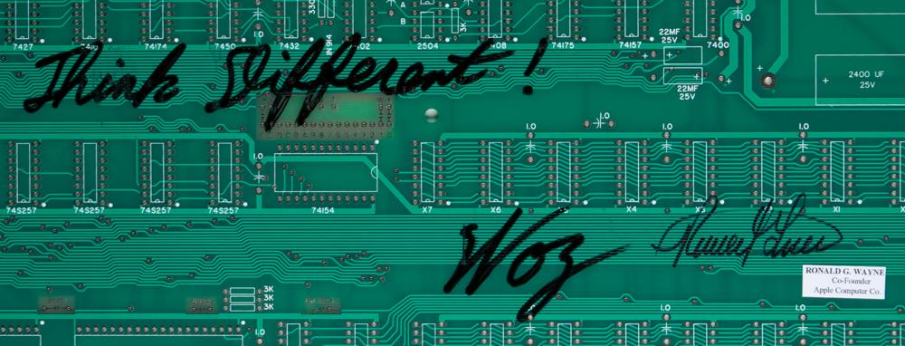 Super desirable replica of the Apple-1 Computer circuit board, 15.5 x 9, signed in black felt tip by two of Apple's co-founders, "Think Different! Woz" and "Ronald Wayne." A small identification label is applied below Wayne's autograph. In very fine condition.