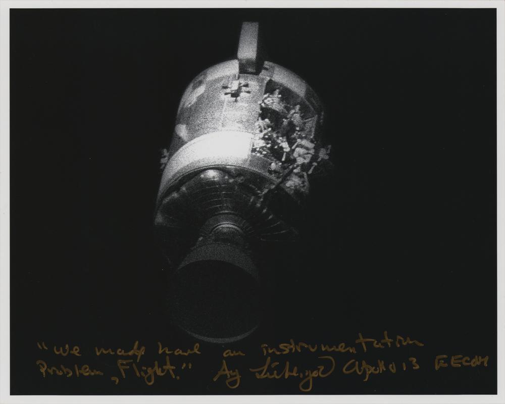 Glossy 10 x 8 photo of the damaged Apollo 13 Service Module, signed in gold ink, "'We may have had an instrumentation problem, Flight,' Sy Liebergot, Apollo 13 EECOM." In very fine condition.