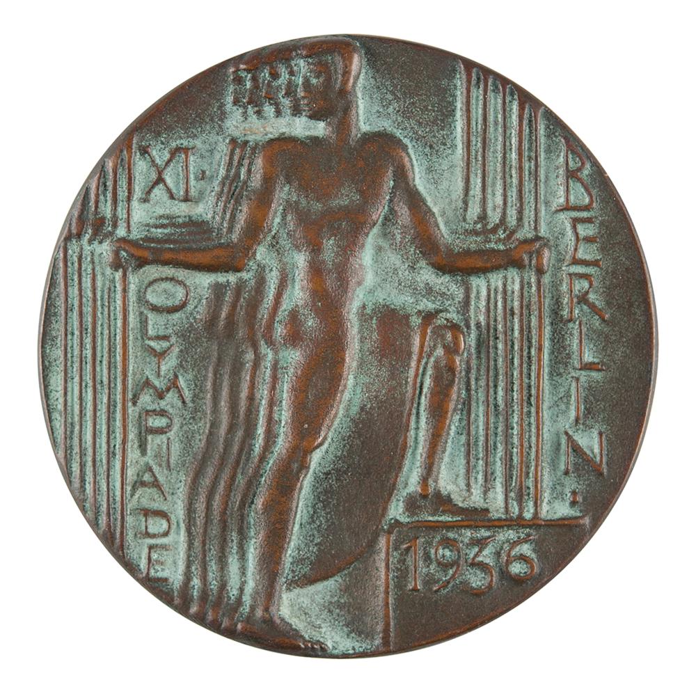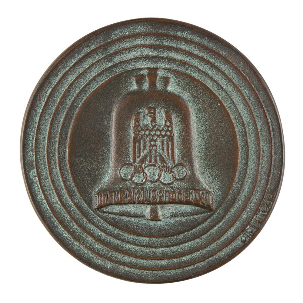 Participation medal issued for the Berlin 1936 Summer Olympics. Green brown bronze, 70 mm, 114 gm, by Otto Placzek. The front depicts five athletes, representing the five continents, pulling the ropes of the Olympic bell, with raised text, "XI Olympiade, Berlin, 1936"; the reverse bears the Olympic bell embossed with the German eagle gripping the Olympic rings within five concentric circles, the name of the designer on the outer edge. The medal bears hints of verdigris patina, a common condition for these medals. Includes its original red paper case, with the rim to lower portion almost entirely detached.